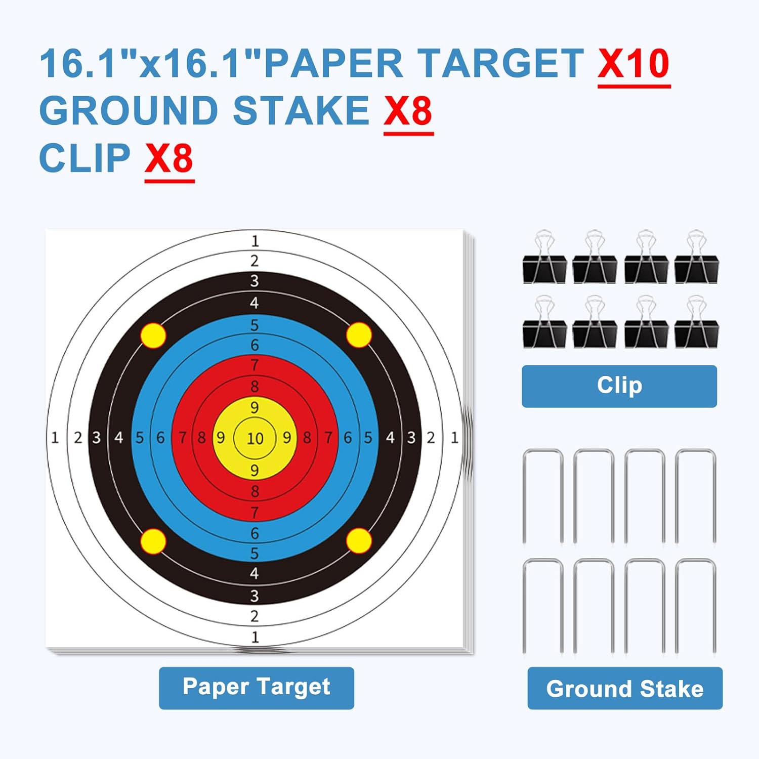 • Target stand set: Includes 2 target stands, 10 pieces 16''x16" shooting paper targets, 8 paper clips, and 8 ground stakes. Please note that 1x2 board is not included. NO WOOD, NEED TO BUY YOURSELF!!!