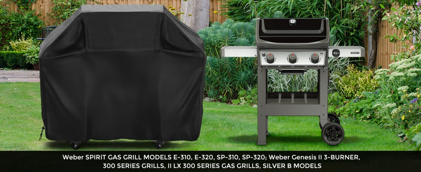 58" Broad Compatibility - The BBQ grill cover measures 58"L x 24"W x 48"H. It fits the most popular models of the grill, such as Weber Spirit gas grill models E-310, E-320, SP-310, SP-320; Weber Genesis II 3-BURNER, 300 SERIES GRILLS, II LX 300 SERIES GAS GRILLS, SILVER B MODELS; 3-BURNER GRILLS, etc.