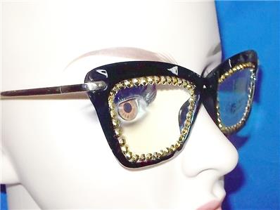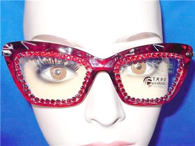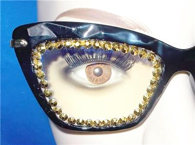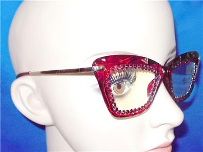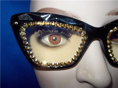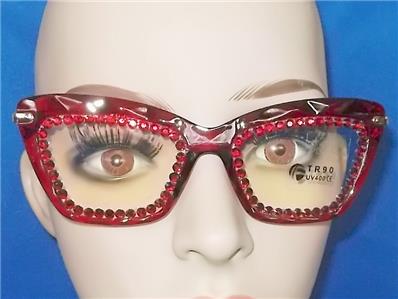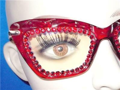 THE RHINESTONES AROUND THE LENS PERIMETER ARE RUBY RED AND GOLD.
