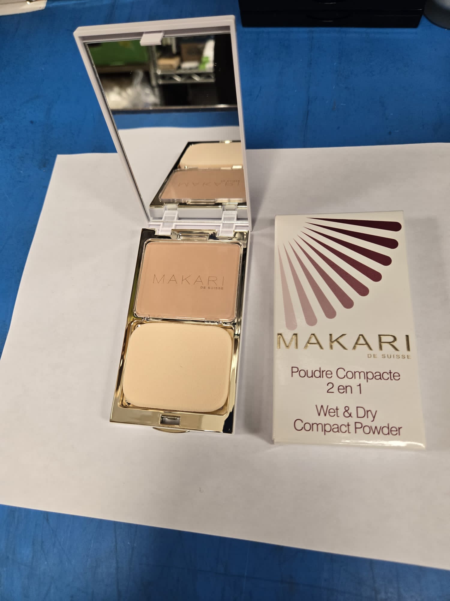 Makari Wet Dry Compact Powder .49 oz This compact powder keeps a handle on shine. The formula is finely milled and provides a smooth, flawless finish to skin. Skin looks clean and polished, never cakey or heavy. It is perfect for touchups anytime, anywhere. Compressed in a pallet with a mirror on the inner lid and a soft facial sponge for convenient application. Choose from a variety of colors. Convenient for traveling. Long lasting and prevents skin from oil deposits. INGREDIENTS: TALC, WATER, MICA, DIMETHICONE, TITANIUM DIOXIDE, DIMETHICONE/VINYLDIMETHICONE CROSSPOLYMER, CEOPENTYL GLYCOL DIETHYLHEXANOATE, SQUALANE, PHENOXYETHANOL, METHYLPARABEN, ETHYLPARABEN, TETRASODIUM EDTA. UPC: 3760096840269