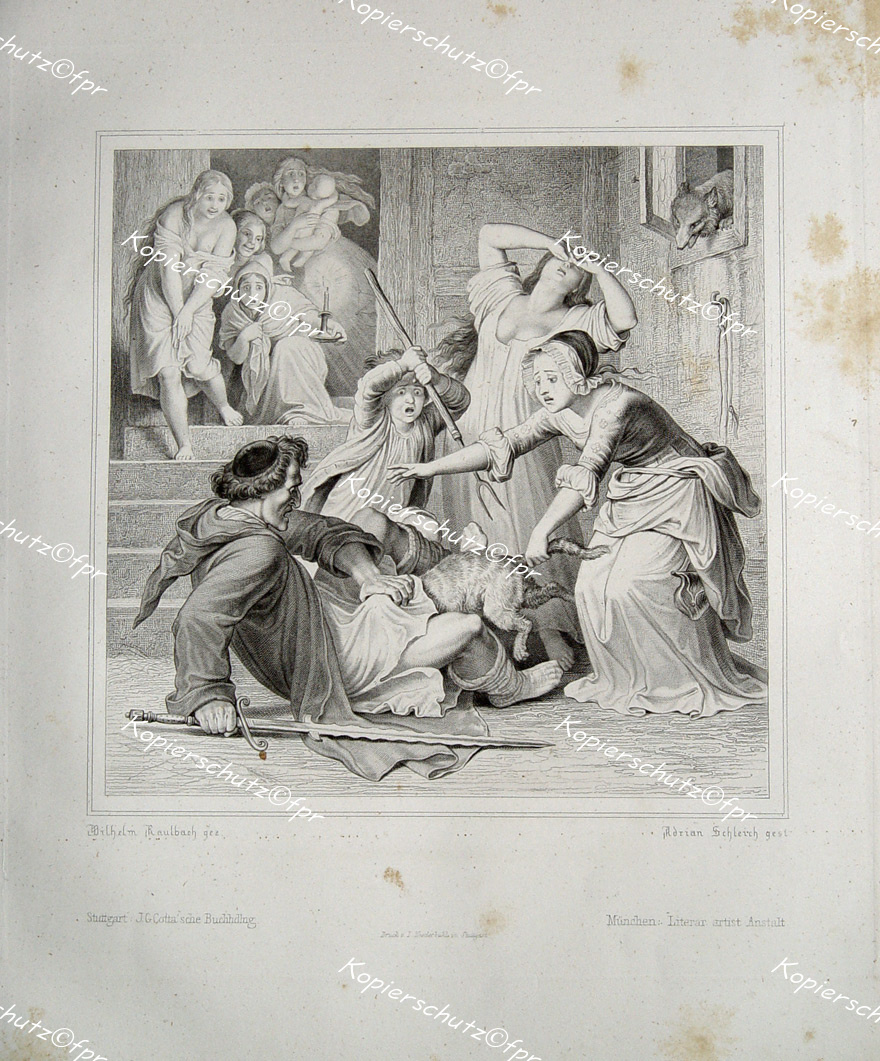 Kaulbach, Wilhelm von (1805 in Arolsen - 1874 in München): "Illustration zu Goethe's Reineke Fuchs" originaler breitrandiger Stahlstich ca.14,5x13,5cm (Darstellung/Image size) auf Bütten-Karton von Rudolf Rahn nach einer Zeichnung von Kaulbach; unterhalb der Darstellung typographisch bezeichnet und betitelt; Cotta Stuttgart 1846