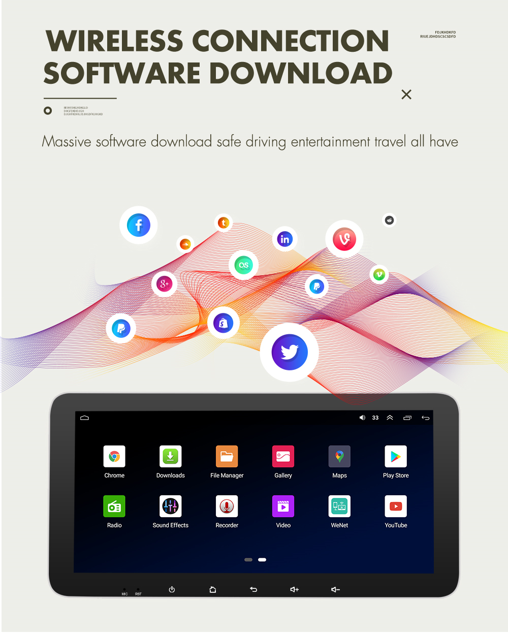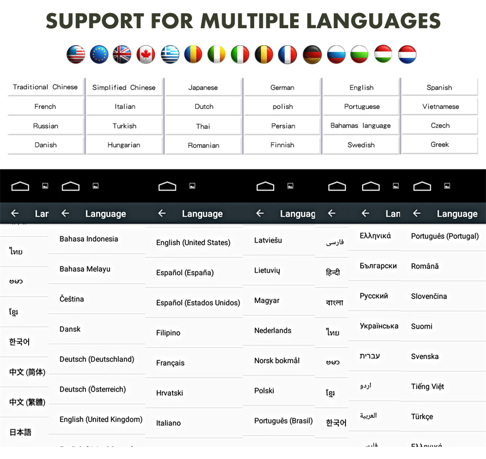 Setup | - WiFi/Hotspot/Bluetooth: Yes - Brightness level adjustable: Yes - Wallpaper: Wallpapers/Live Wallpapers/Gallery - Sound: Key Tone & Volume - Storage: Display Internal Storage/Nand Flash/Connected Device Storage - Apps: Running Apps display/force stop/uninstall - Security: Yes - Accounts: Yes - Languages and Input: more than 70 Languages and choose input method - Backup and Reset: Yes - Date and Time: Setting Date&Time by yourself or choose GPS/network-provided time - Accessibility: Yes - GPS: Yes, GPS application options/monitoring/sound mode/mixing ratio - Driving safety: Watching Video, Reversing X-mirror/Volume, Reversing Trajectory/radar Display, Rear view ruler - Amplifier: Rock/Pop/Jazz/Classic/Flat/Voice/Custom - Steering Wheel Control: Yes - About Device: Display Parameter Info. |