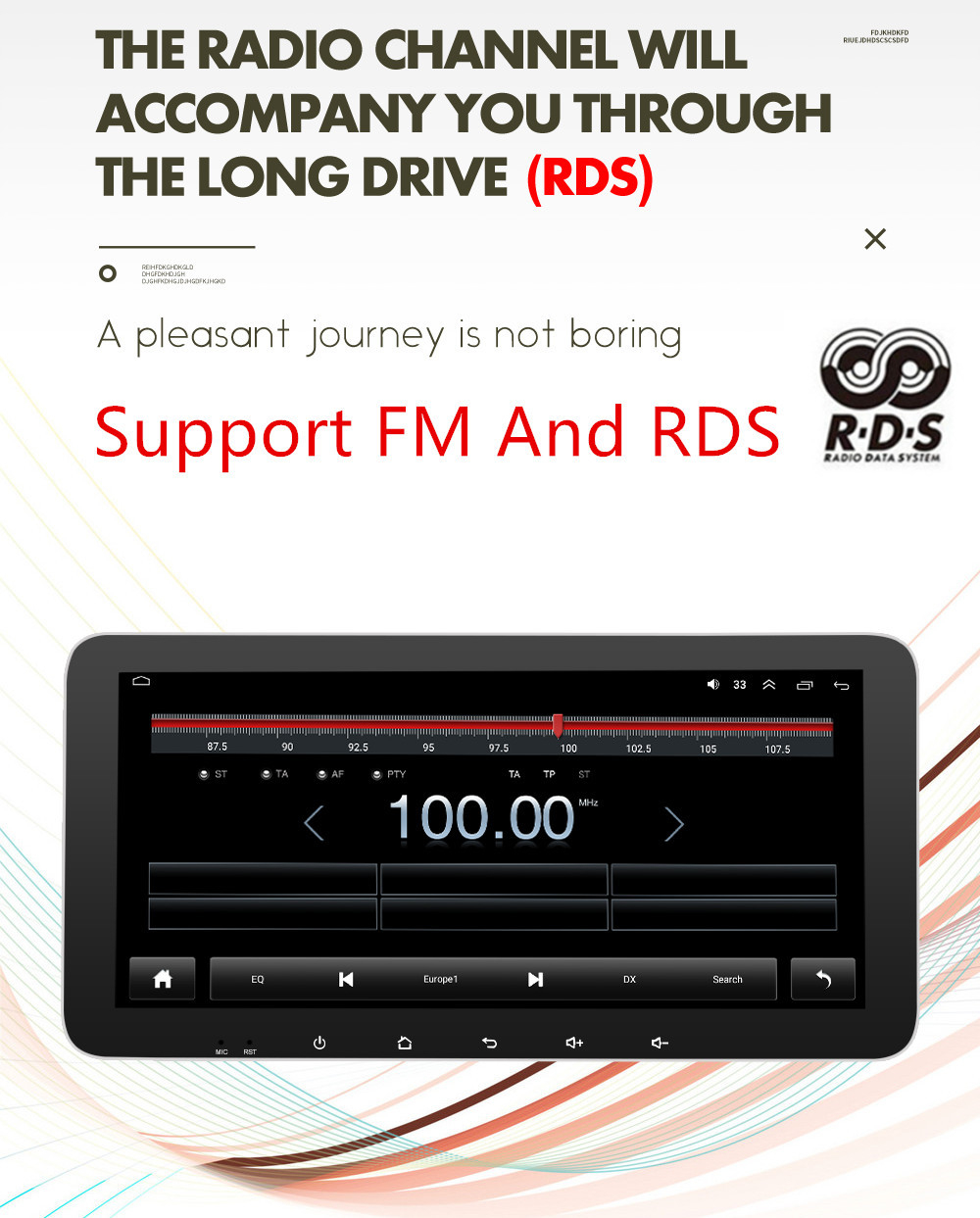 Radio | - FM Tuning Range: 87.5-108MHz - FM Increment: 0.05MHz(EU)/0.1MHz(US) - FM Area: Europe/USA1/USA2/Japan/Russia - RDS:On/Off |