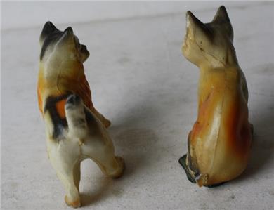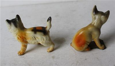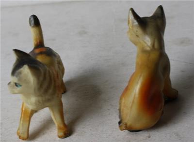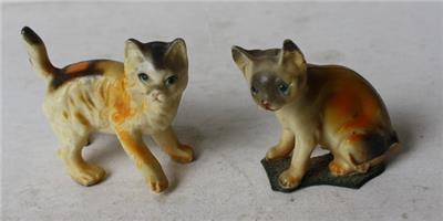 Here is a great vintage miniature Lot os 2 Cats Hard Plastic Made in Hong Kong One standing with paw up the other sitting Cat Figurines. The one sitting has tail broken off-SEE ALL PHOTOS. It is Awesome. It measures about 2 inches tall and about 2 1/4 inches wide. Grab this vintage collectible while you still can it will not last long.