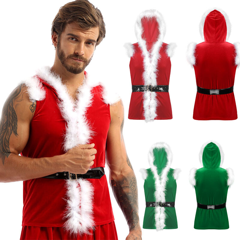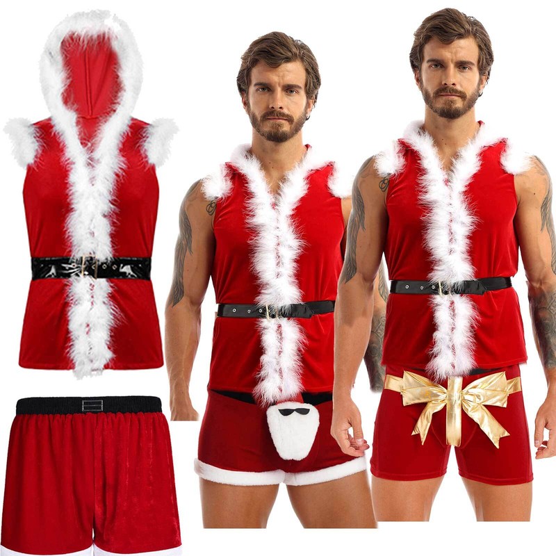 Men Hooded Coat Sleeveless Leather Waistband with Santa Claus Boxer Shorts.
