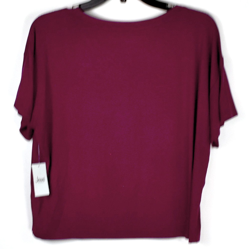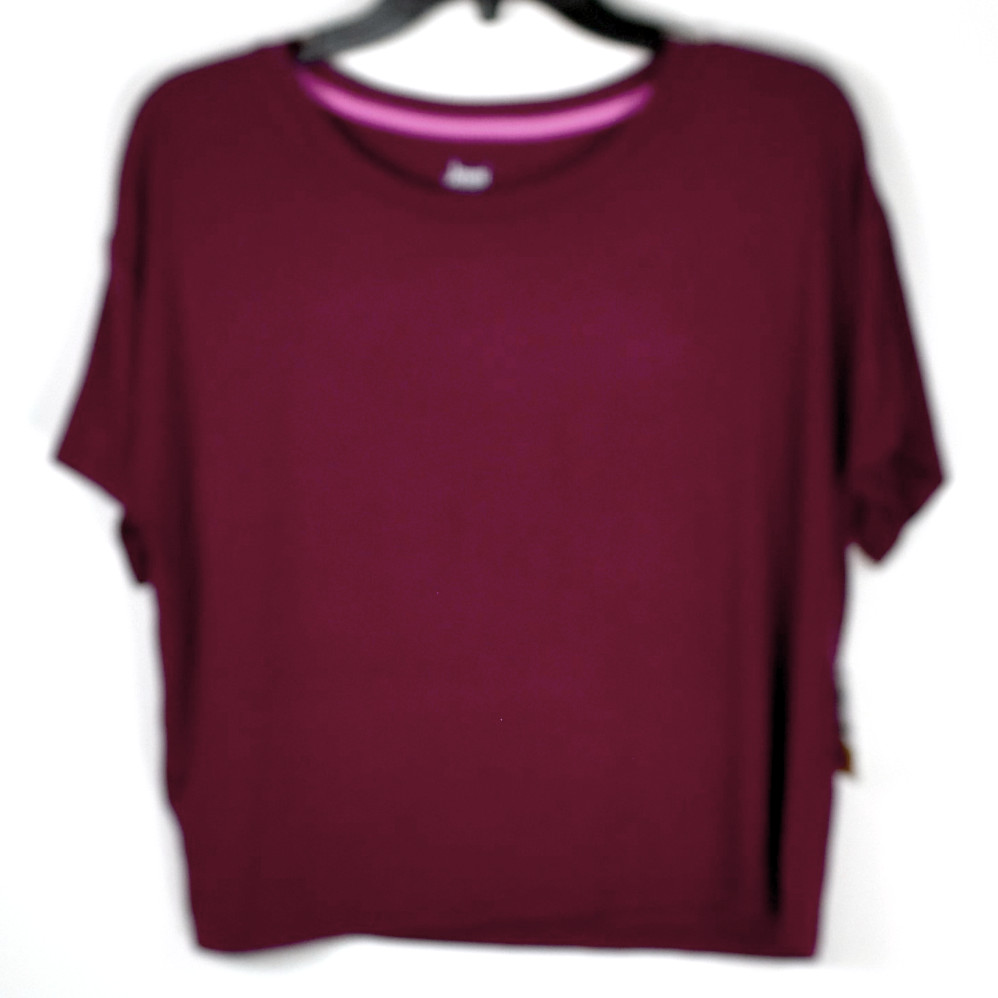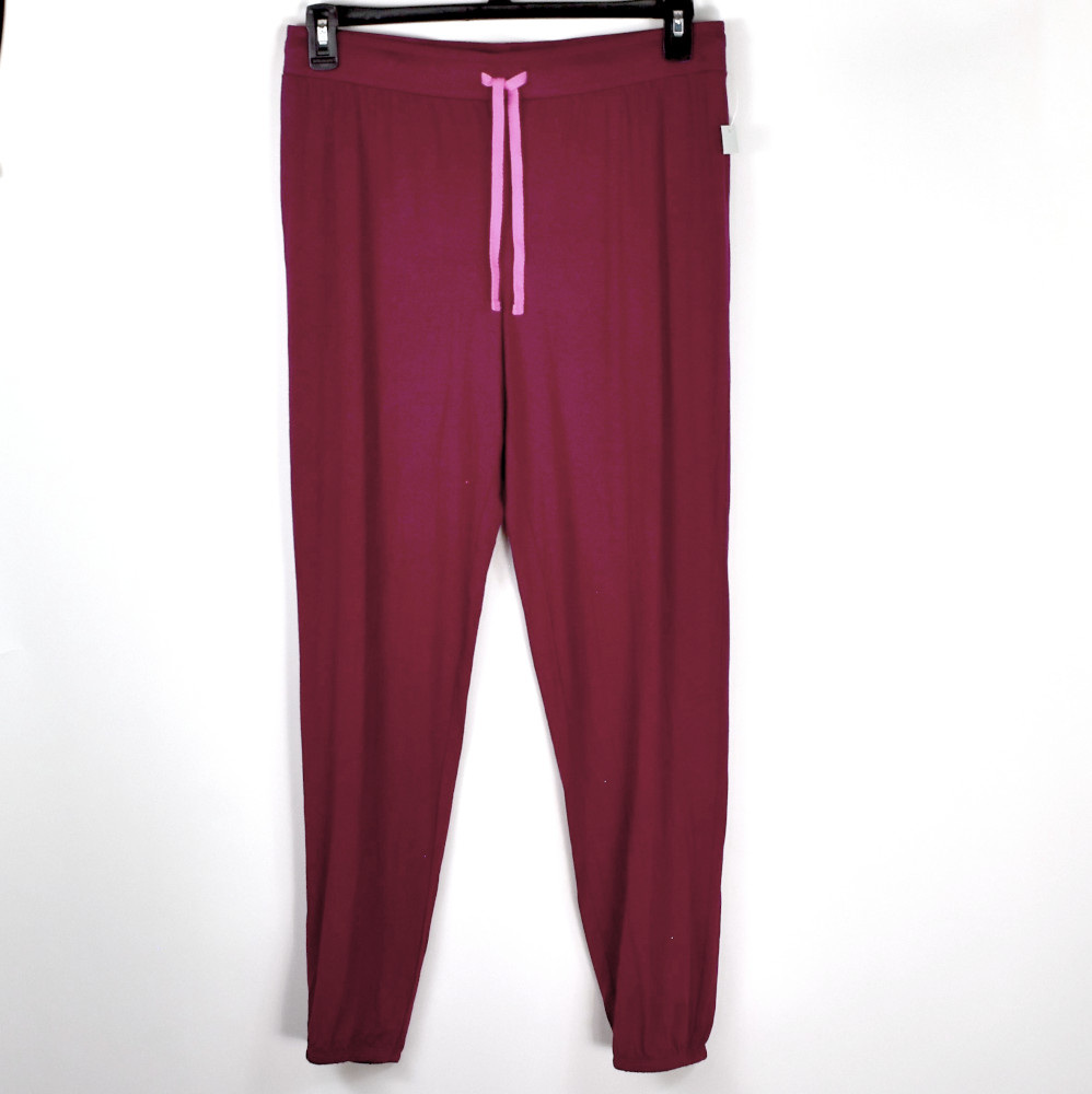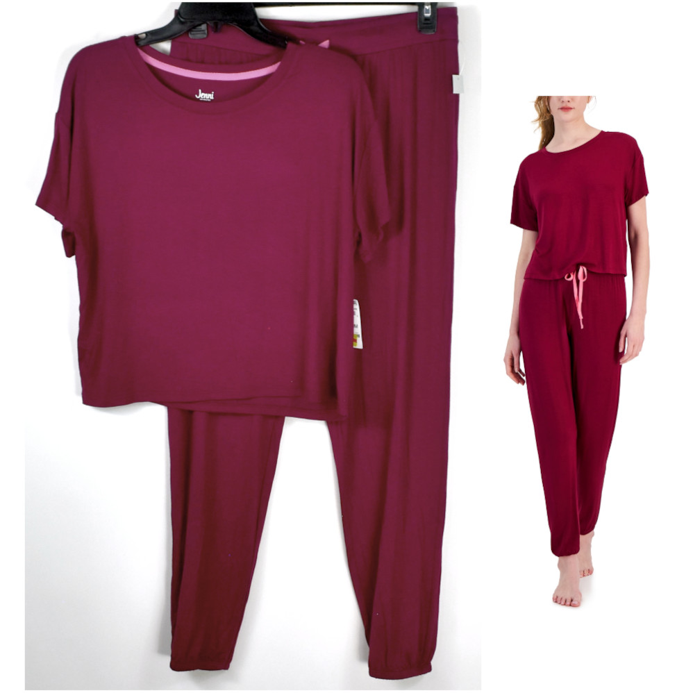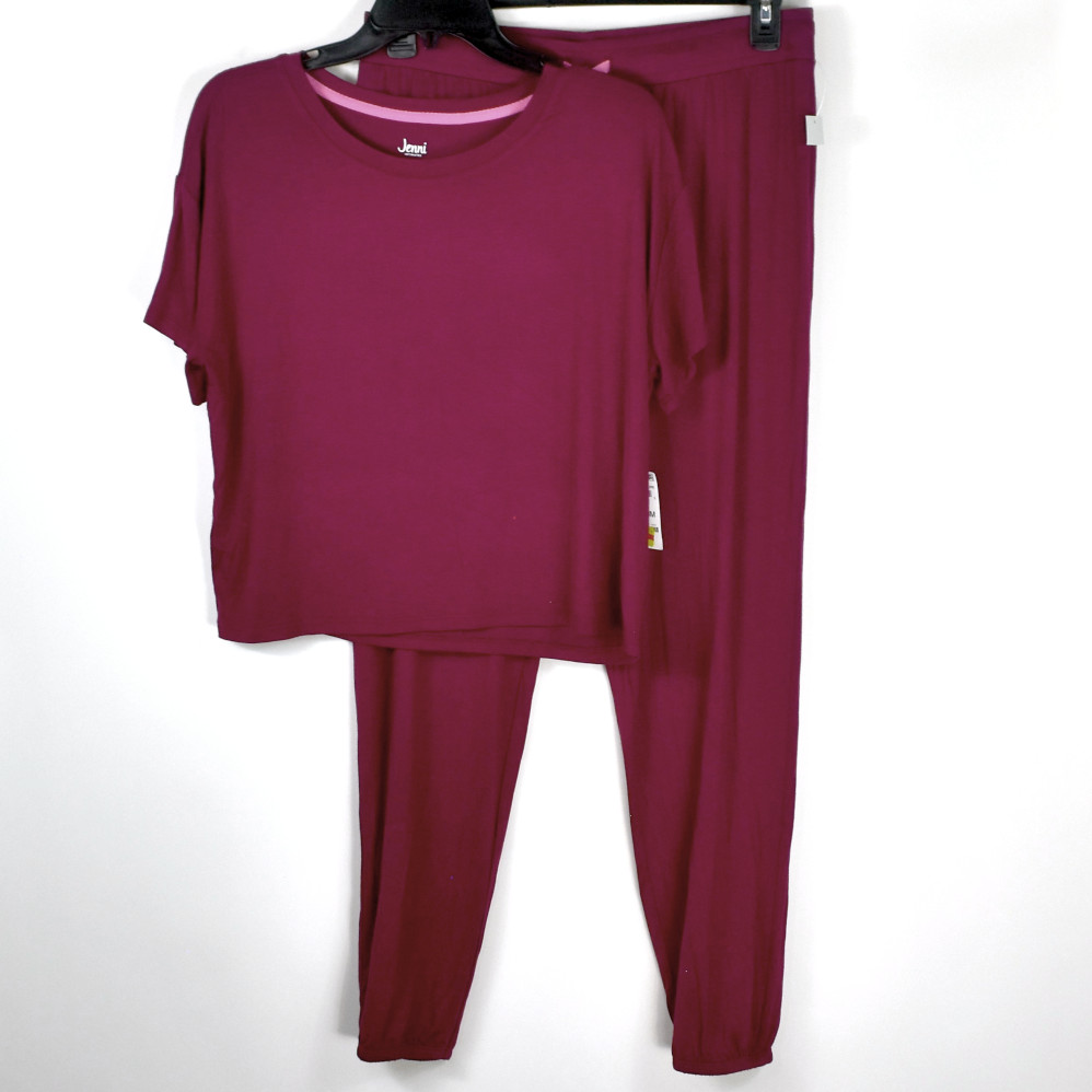 Jenni Short Sleeve Top & Jogger Pajama Pants Set in Red Wine, Size Medium, New with tags, no retail packaging. Lounge in comfort and style with this soft, comfortable Short Sleeve top and jogger style pant set. The pull on top has slightly rounded neckline and short sleeves. The matching pants have a pink drawstring and elastic cuffs. Retail $49.50