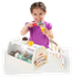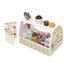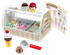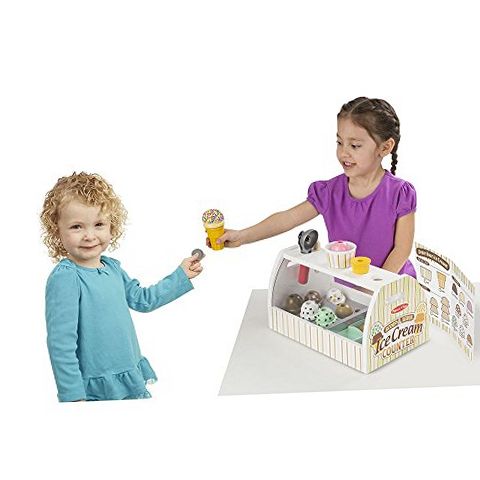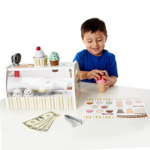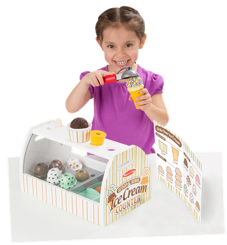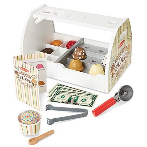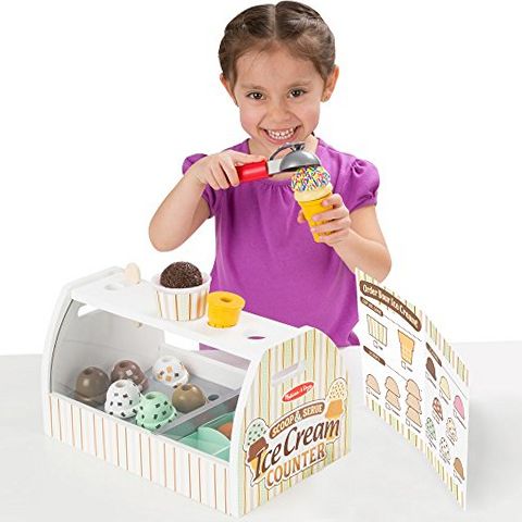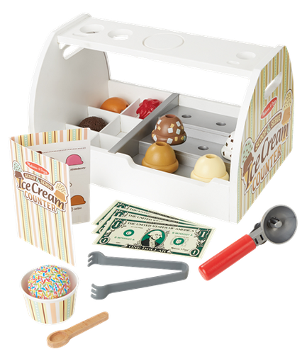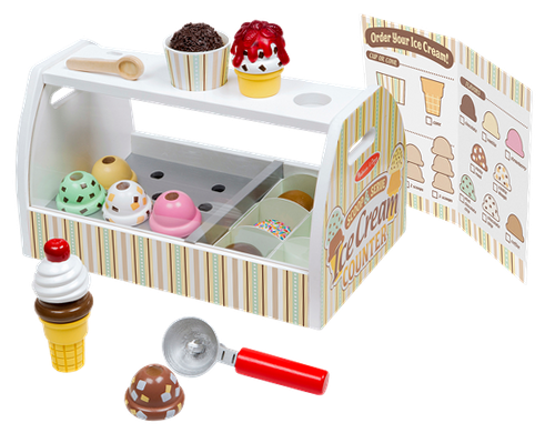 Scoop up some cool treats with this all-inclusive, 20-piece pretend play ice cream counter! the sturdy wooden tabletop counter holds eight wooden scoops of different-flavored ice cream, six multi toppings, two cones, a plastic cup, an ice cream scooper, tongs, and a wooden spoon. The scooper fits into a hole on top of the scoops to lift, stack, and release. Take orders on the reusable menu card and serve up delicious fun!.