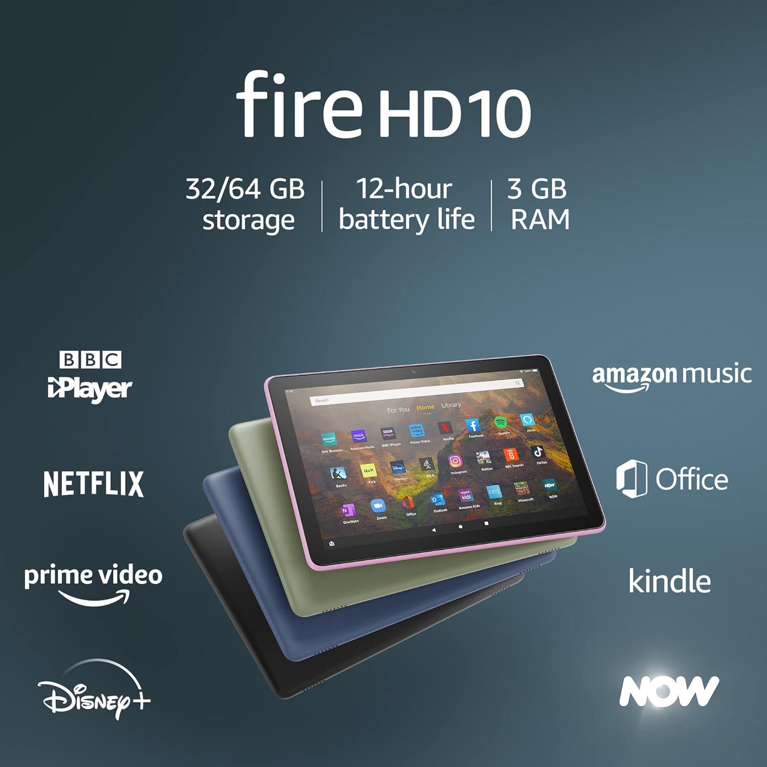 Enjoy up to 12 hours of reading, browsing the web over Wi-Fi, watching videos and listening to music from anywhere. Power back up via the USB-C (2.0) port. Amazon engineers Fire tablets to withstand everyday life. As measured in tumble tests, Fire HD 10 is 1.7 times more durable than the latest iPad 10.2. Screen made with strengthened aluminium silicate glass.