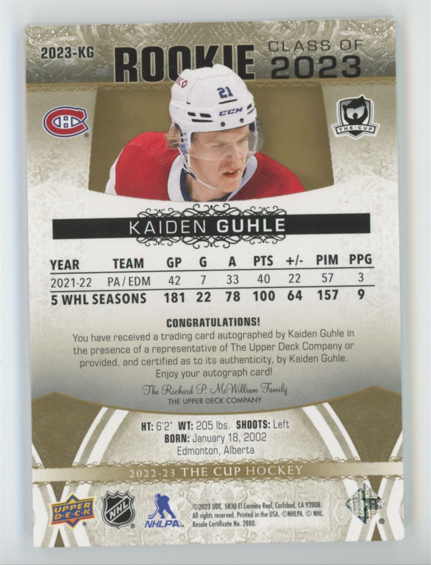 | 2023-24 UD The Cup Rookie Class Autograph Kaiden Guhle RC Auto 27/50 Montreal |