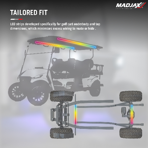 Personalize your golf cart with these vibrant LED underglow light strips! These strips sync with the MadJax® Smartphone App to become fully customizable, allowing you to change colors, patterns, and effects to stand out during nighttime rides. These lights will also sync up with your other MadJax® LUX lighting to totally transform your ride.