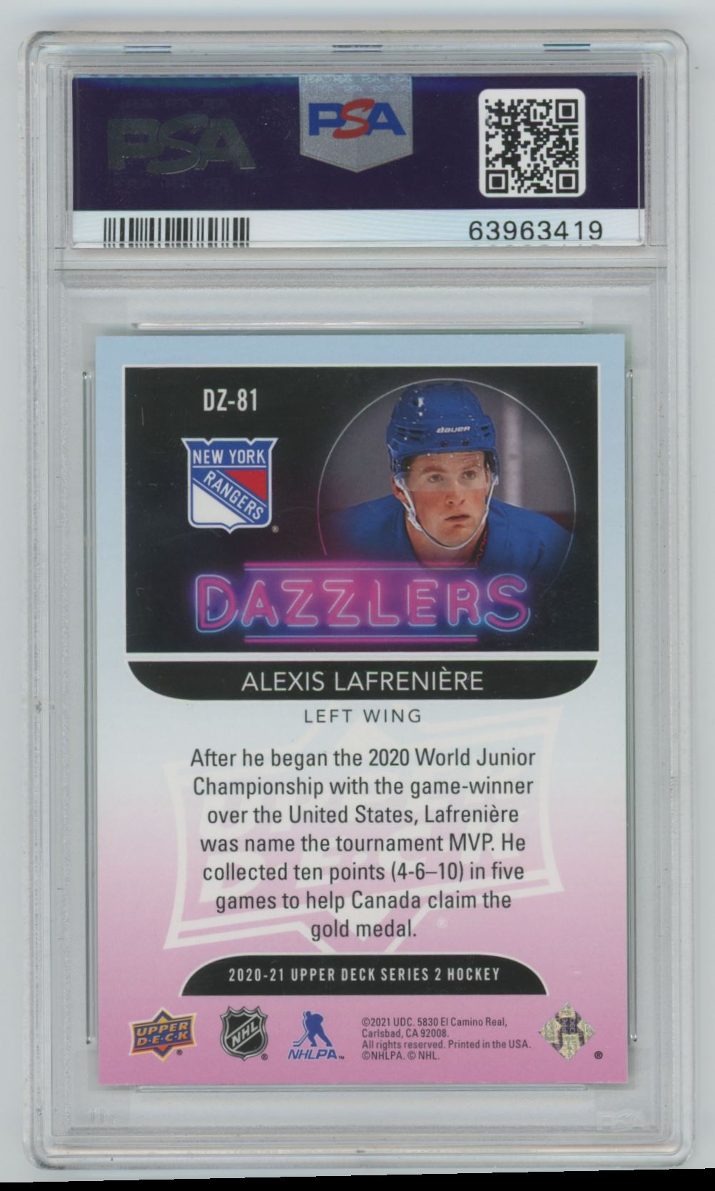 | 2020-21 UD Dazzlers Green Rookie Alexis Lafreniere RC PSA 10 New York Rangers |