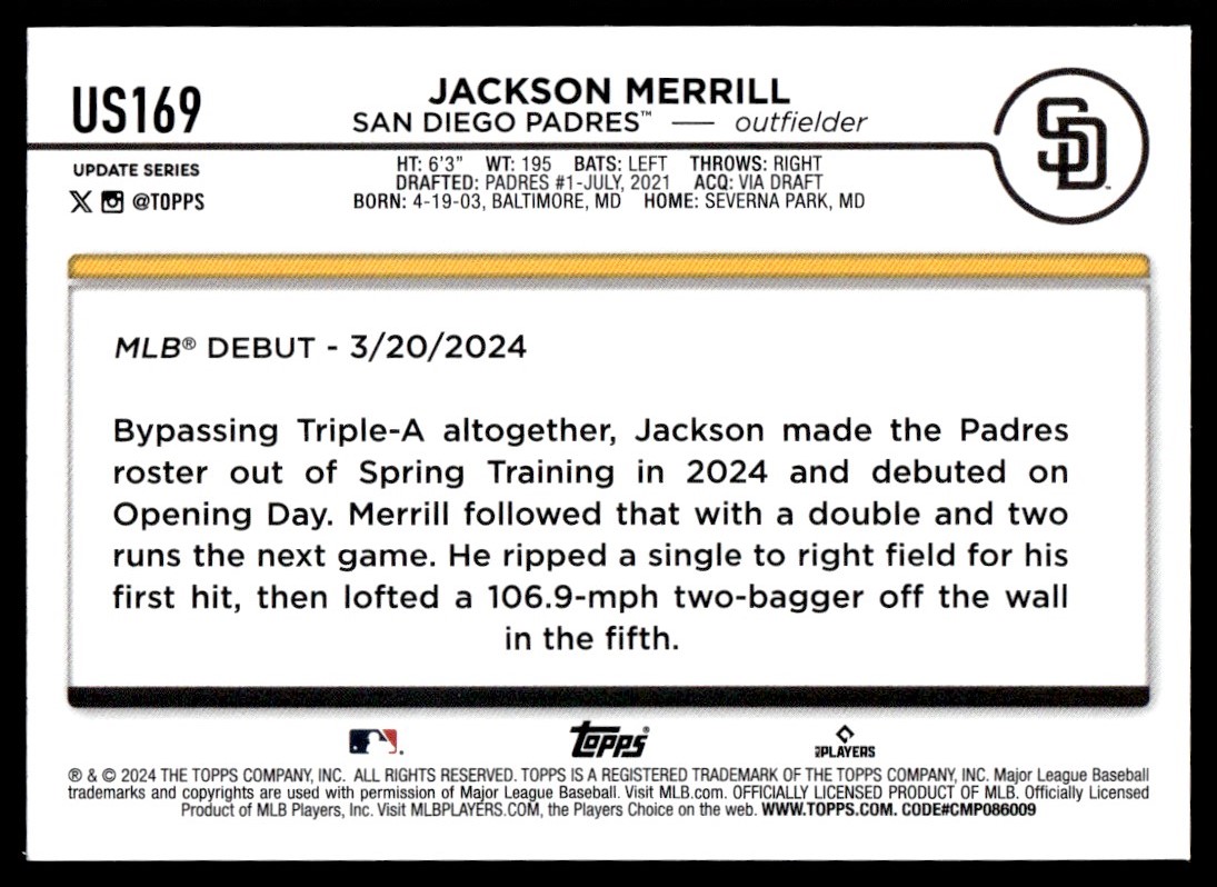 2024 Topps Update Jackson Merrill Rookie San Diego Padres #US169