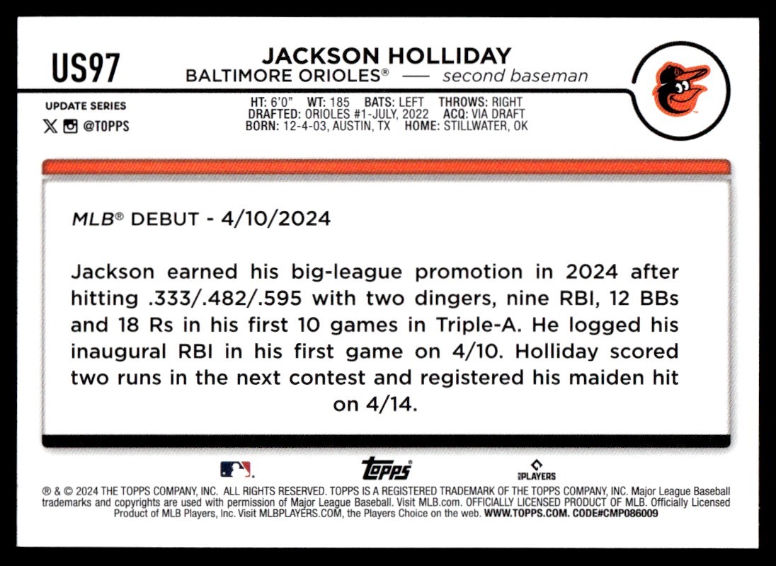 2024 Topps Update Jackson Holliday Rookie Baltimore Orioles #US97
