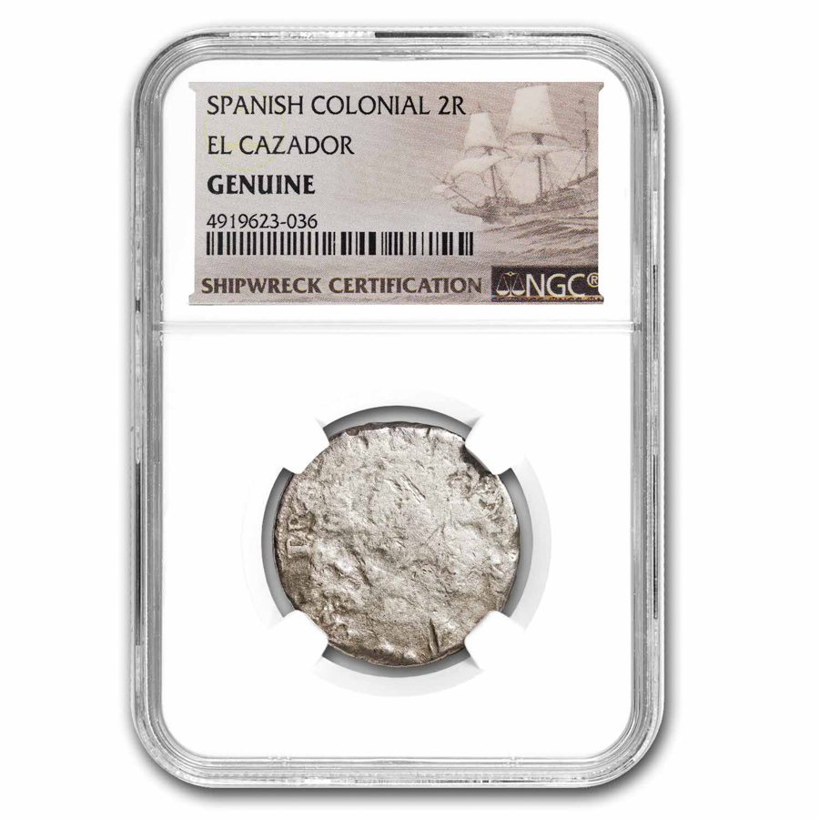 The El Cazador shipwreck contained mostly 400,000 Pesos of Silver in 8 Reales coinage with a smaller number of 4 Reales and 2 Reales coins also being contained within the ship's manifest. Most coinage from this wreck was dated from 1783 with several pieces being back dated several years. The captain and crew would also have carried a variety of older types of Spanish milled coinage including the Pillar Dollar variety and other circulating coins of the period.