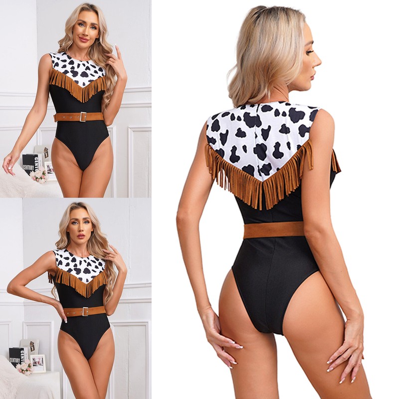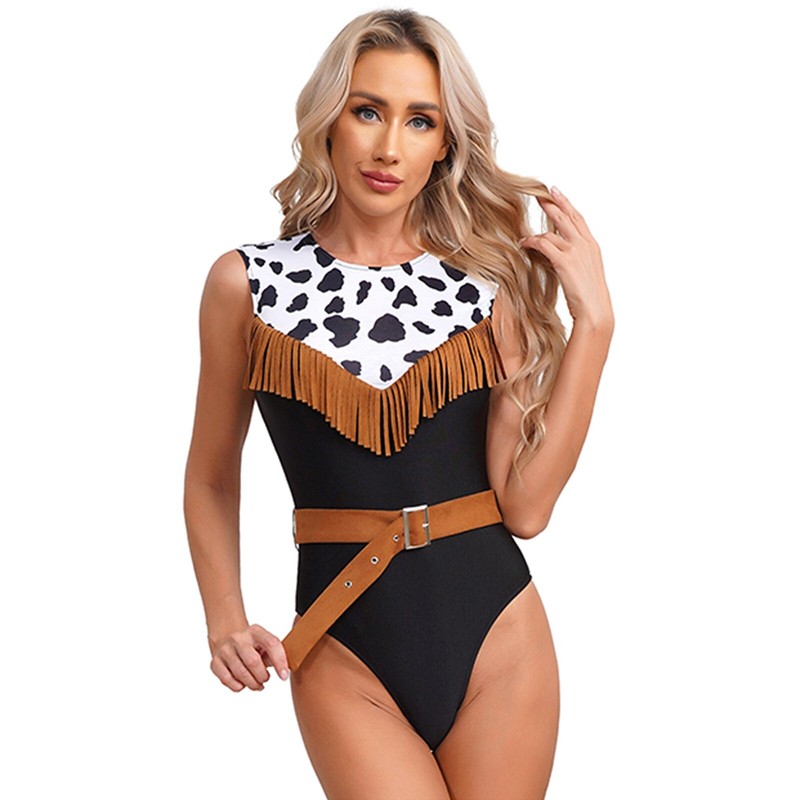 Women cowgirl dress-up bodysuit designs with round neck, sleeveless, cow point print contrast, V-shape tassel and back zipper closure.