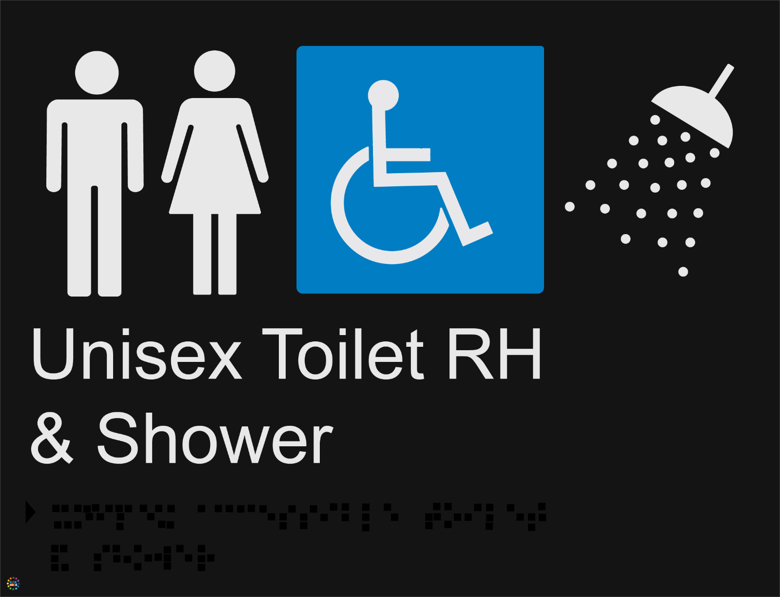 Enhance accessibility and provide clear directional guidance with the Unisex Disabled Shower RH Braille and Tactile Sign (BR86), designed to guide individuals toward right-hand unisex disabled shower facilities in public buildings, workplaces, and community environments. This sign features raised tactile text, Grade 1 Braille, and a clear, unisex disabled shower symbol oriented for right-hand entrances, assisting people with low vision to confidently locate the correct amenities. Ideal for offices, schools, hospitals, gyms, transport hubs, and hospitality venues, it promotes safe movement while supporting consistent accessibility communication throughout your premises. Manufactured from durable 3mm thick PVC, the sign is available in a silver background with black text or a black background with white text, providing strong contrast and long-lasting readability in indoor or sheltered outdoor areas. Weather-resistant, impact-resistant, and supplied with secure double-sided tape, it allows fast and reliable installation on smooth, clean surfaces. Fully compliant with BCA/NCC Part D4D7, Specification 15, and AS1428.1-2009, the sign ensures dependable guidance and clear identification of right-hand unisex disabled shower facilities for all users.ROBUST BUILD QUALITY: Made from 3mm PVC with a single-piece moulded structure that enhances hygiene, prevents dirt accumulation, resists cracking or delamination, and endures frequent handling and routine cleaning in high-traffic areas where durable tactile guidance is essential for consistent accessibilityFINISH OPTIONS: Available in two high-contrast variations, including a silver background with bold black text for a clean modern presentation or a black background with bright white text that improves visibility for low-vision users, ensuring clear readability across offices, educational facilities, public buildings, and healthcare environmentsOPTIMAL DIMENSIONS: Produced in a 210mm x 180mm format that provides ample room for tactile lettering, accurately spaced Braille, and a well-structured layout while remaining compact enough for mounting on doors, walls, and access points without obstructing surrounding architectural features or creating visual clutterRELIABLE PERFORMANCE: Engineered to withstand environmental exposure and frequent handling, maintaining clarity and long-term functionality whether installed indoors along busy corridors or outdoors in exposed areas where sunlight, moisture, temperature fluctuations, and regular contact could otherwise compromise readability and durabilityEASY FIXING METHOD: Supplied with strong double-sided tape for fast, tool-free installation on smooth, clean surfaces, providing secure adhesion suitable for rapid accessibility upgrades, efficient repositioning, and stable placement on doors, walls, and approach areas where tactile guidance is required