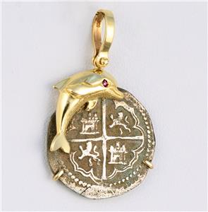 Mounted in a beautiful Solid 14kt yellow gold dolphin pendant with genuine faceted ruby eye. The pendant is new and has never been worn. This treasure cob coin pendant measures 1 3/8" tall and 7/8" wide.