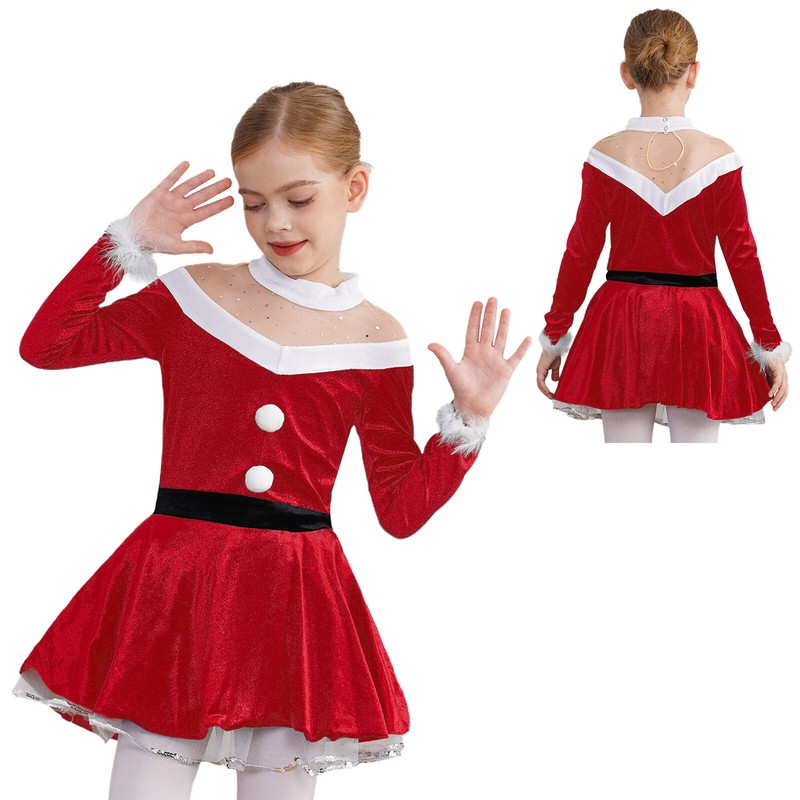 Kids Girls Dress Pompom Unitard Xmas Dresses Party Leotard Stage Outfit Show