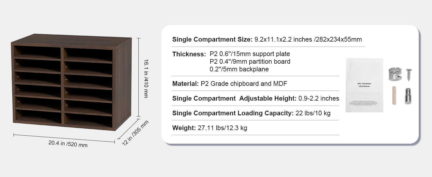 - Maximize Your Space: Say goodbye to cluttered desktops 20.4''x12''x16.1'' wood literature organizer. It has 12 compartments in total, arranged in 6 rows and 2 columns. You'll have ample space to store and organize books, documents, magazines, papers, and other materials. Keep your workspace neat and tidy with ease.