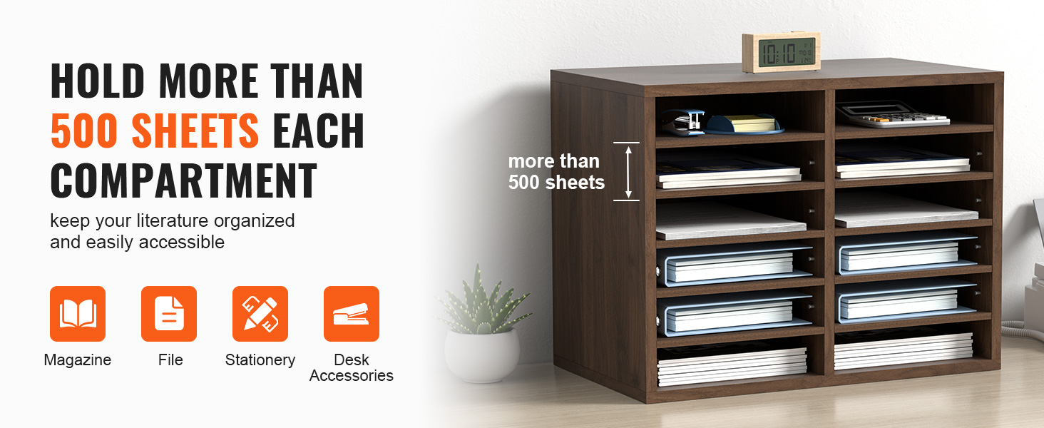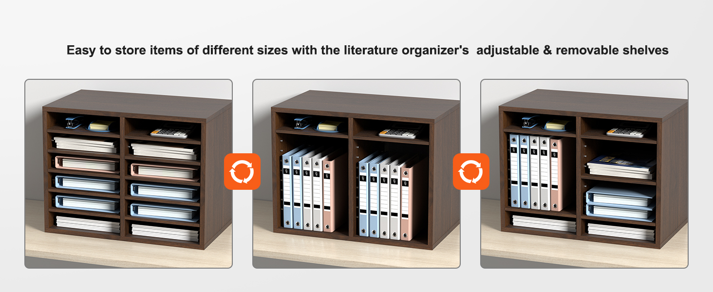12-compartment literature organizer keeps your literature, files, and forms organized and easily accessible. Each compartment provides ample space to store your papers, and the removable shelves can be adjusted to create taller compartments for larger binders. Tidy up your space.