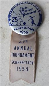 Here is a great vintage Bowling Pinback Button from Schenectady New York New York State Women's Bowling Association 25th Annual Championship Tournament 1958 Bowling Pinback celluloid Pin with Ribbon Black White. It is Awesome. It is in Good Condition-SEE ALL PHOTOS. It measures about 4 inches tall with ribbon by about 1 3/4 inches wide. Grab this great Bowling Pinback Pin with ribbon Collectible while you still can it will not last long.