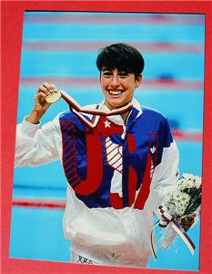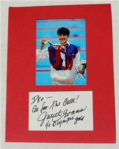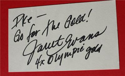 Here is a great vintage authentic Janet Evans Olympic Swimmer hand signed Autographed 3X5 Card. It has a NEW 4X6 photo on an overall 8 1/2 X11 autographed mat. It is Awesome. It measures about 11 inches tall by about 8 1/2 inches wide. Great Autograph-SEE ALL PHOTOS! Grab this great vintage collectible while you still can at this price it will not last long.