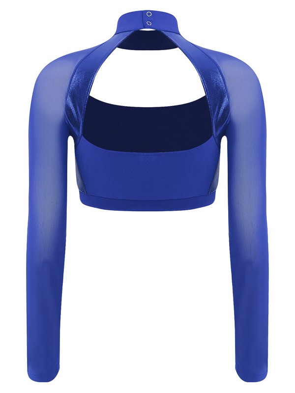 Designed with mock neck, mesh long sleeve, cut out at front and open back, crop top with elastic bottom.