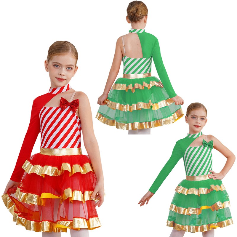 Decorated with stripes at collar and sleeves, cute red bow tie and shiny metallic patchwork at waist.
