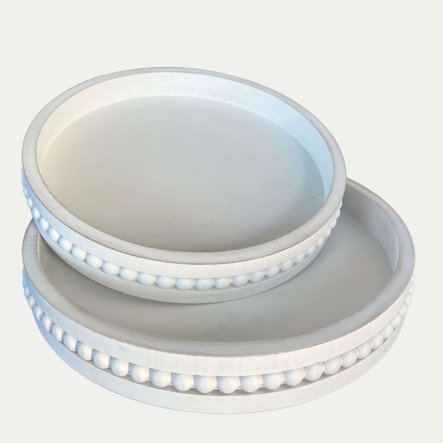 White Beaded Decorative Tray Set (2-Pack) - Round Rustic Decor Wooden Serving Trays, Distressed Farmhouse Design Centerpiece for Coffee Table, Ottoman, Counter, Living Room & Home