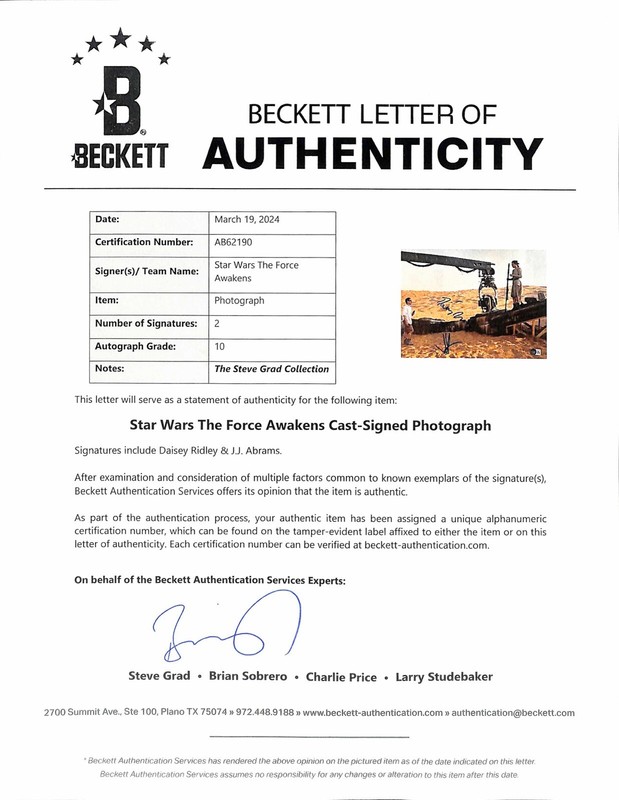 Autographed 11x14 photograph signed flawlessly in blue permanent marker by Daisy Ridley and JJ Abrams behind the scenes filming from Star Wars The Force Awakens. From the Steve Grad Autograph Collection. The autograph is accompanied by a full LOA from Beckett Authentication services #AB62190