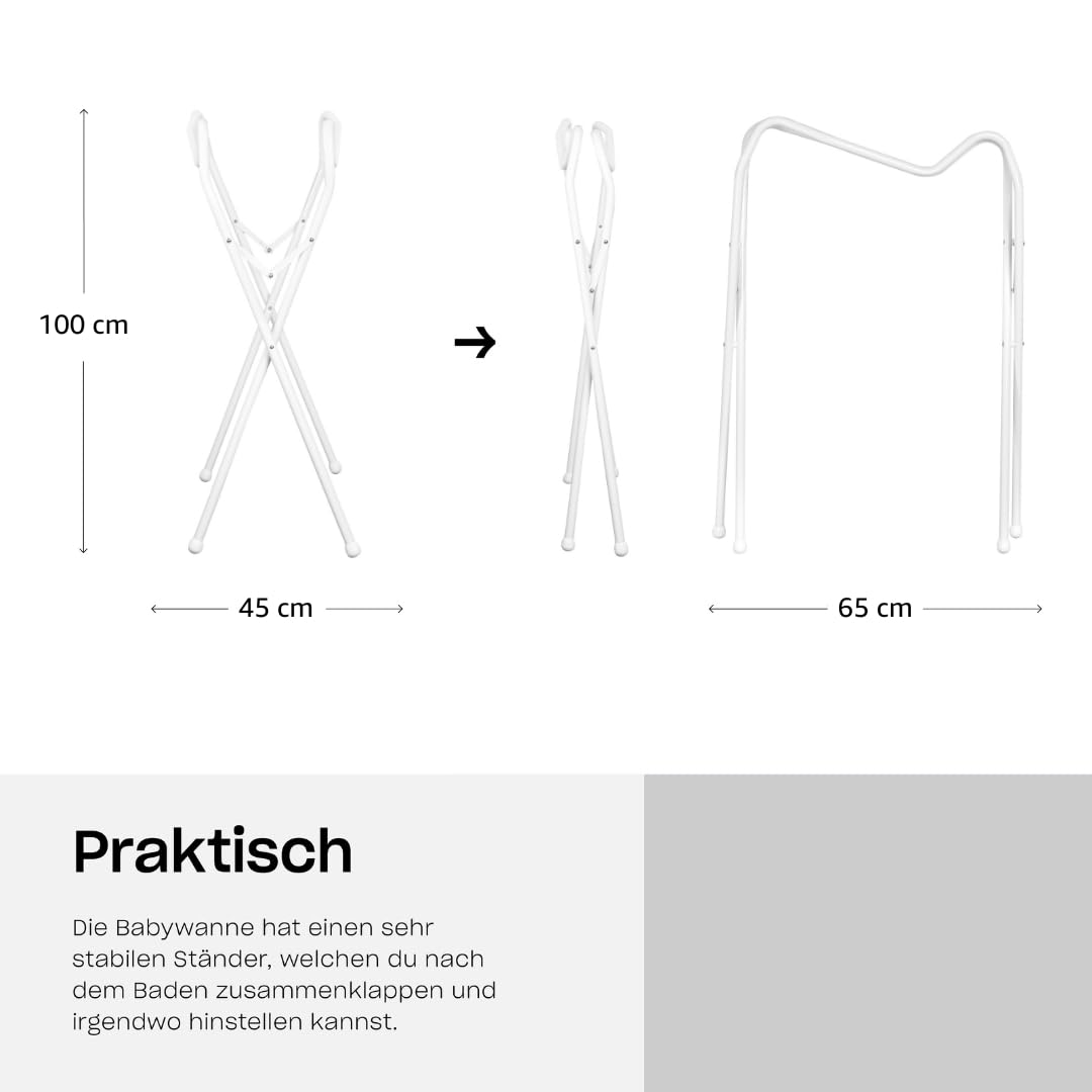 Die Hylat-Babywanne wird mit einem stabilen, zusammenklappbaren Gestell geliefert, das eine angenehme Badehöhe bietet und so besonders rückenfreundlich ist. Nach Gebrauch lässt sich das Gestell auf eine Breite von nur 12 cm zusammenklappen, wodurch es einfach zu verstauen und platzsparend ist – die perfekte Wahl für moderne Familien.