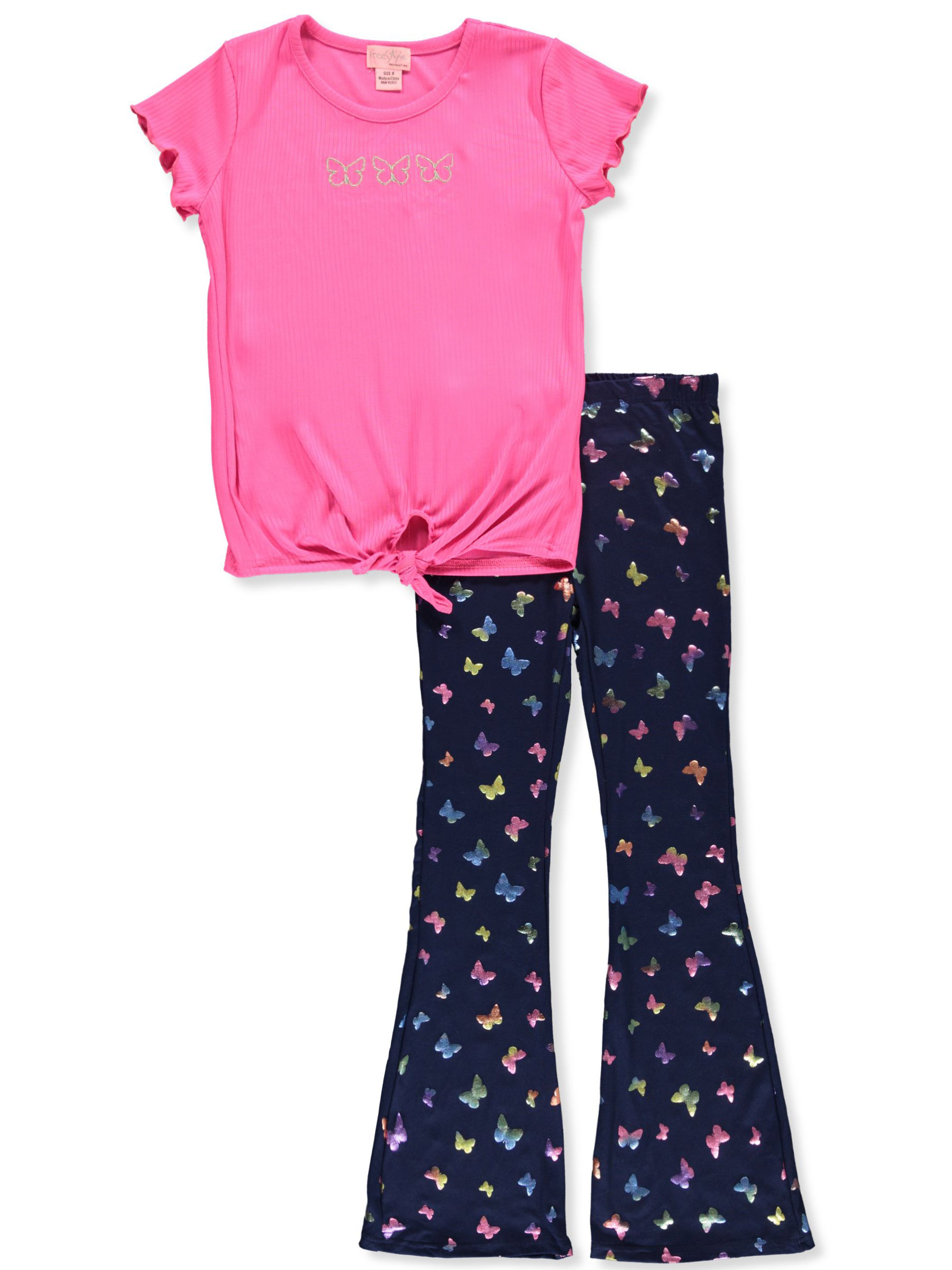 Sweeten her look with this outfit by Freestyle Revolution. Freestyle Revolution outfit T-shirt with graphic applique and ribbed trim (100% polyester) Flared leggings with elastic waistband (95% polyester, 5% spandex) Machine wash cold Made in Bangladesh