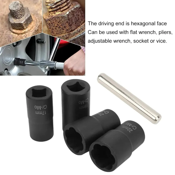 Struggling with stripped, rusted, or stuck bolts and nuts? This 5-piece extractor socket set is your solution. Designed for use with a 1/2" drive wrench, ratchet, or breaker bar, these sockets feature a 6-point spiral design for a secure grip on damaged fasteners. Constructed from durable 42CrMo ultra-high strength steel, this set includes 17mm, 19mm, 21mm, and 22mm sockets, plus a punch tool for easy fastener removal. Perfect for automotive repairs, maintenance, and more.