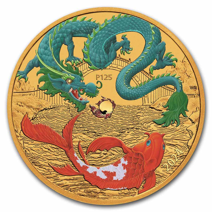 Add this spectacular 2024 Australia 1 oz Gold Myths and Legends Dragon and Koi coin to your cart today!