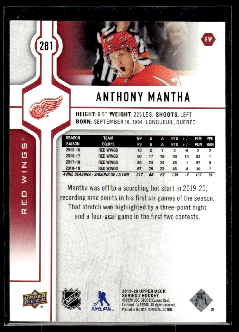 | 2019-20 Upper Deck UD Exclusives Anthony Mantha /100 Detroit Red Wings #281 |