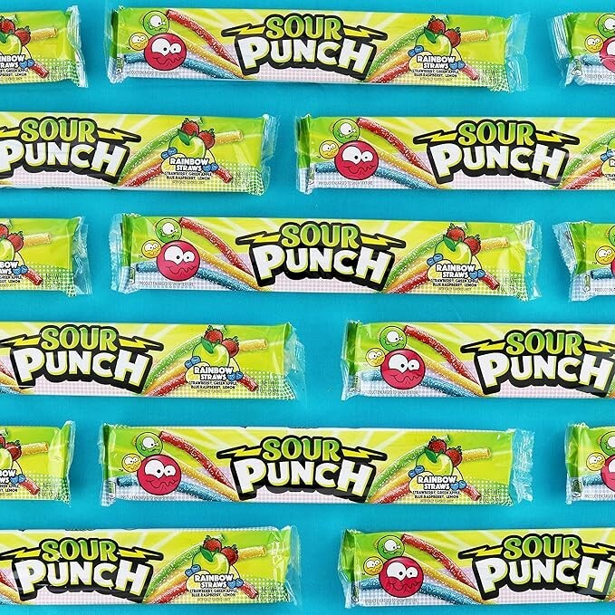 - Each 2oz SOUR PUNCH candy flavors: Strawberry, Apple, Blue Raspberry & Lemon