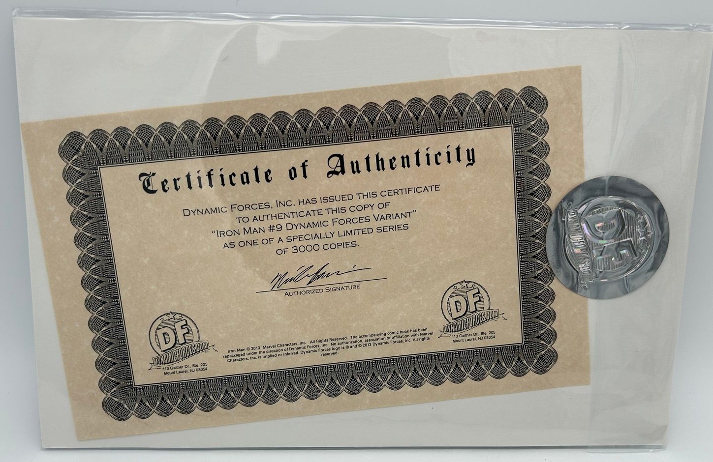 A fantastic copy of Iron man #9 The Secret Origin of Tony Stark. This is the Dynamic Forces version and it is sealed with the certificate on the back. It is limited to 3,000. It is super nice and unread. In fantastic unread mint condition. A great chance to get this book at a good starting price. Pictures are very representative. Please look at my other auctions for a bunch more comics including many variants. This will ship very secure and in a box. I am not a dealer but a discerning collector who is weeding out my collection. Please feel free to ask questions. Winning bidder will pay $7.00 postage and handling for this lot and I will combine shipping and I will ship in a box. As always there are no reserves on my auctions. I have been selling on eBay since 1996 so please bid with confidence. Email questions are welcome and as always thanks for looking! Click here to view my other auction items |