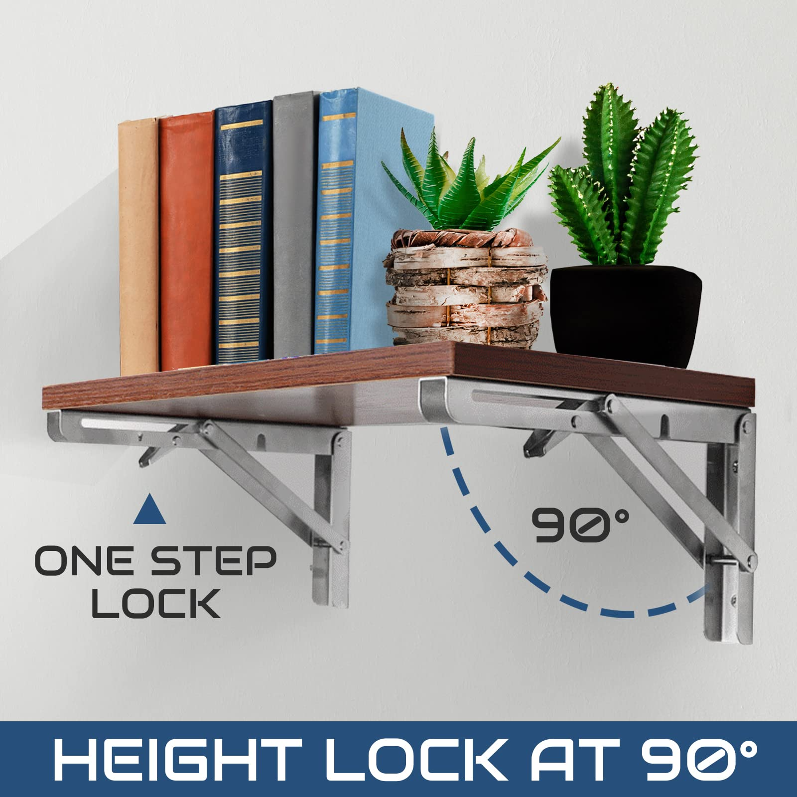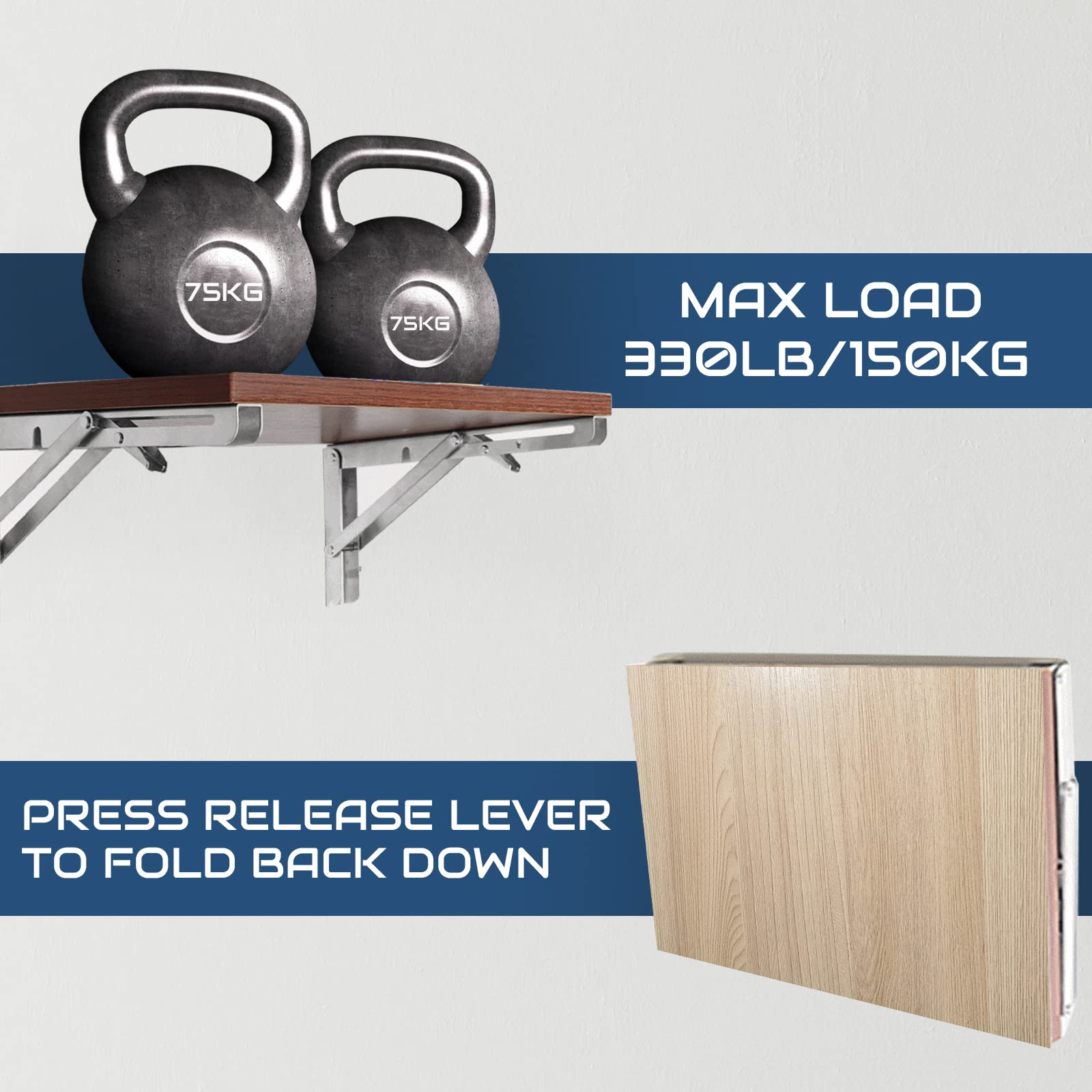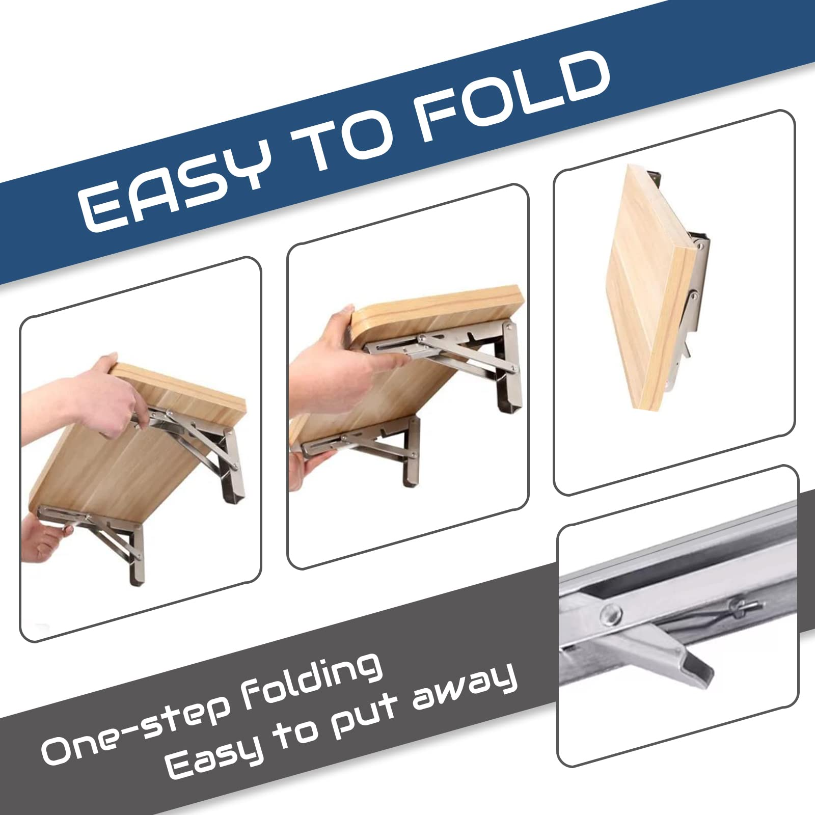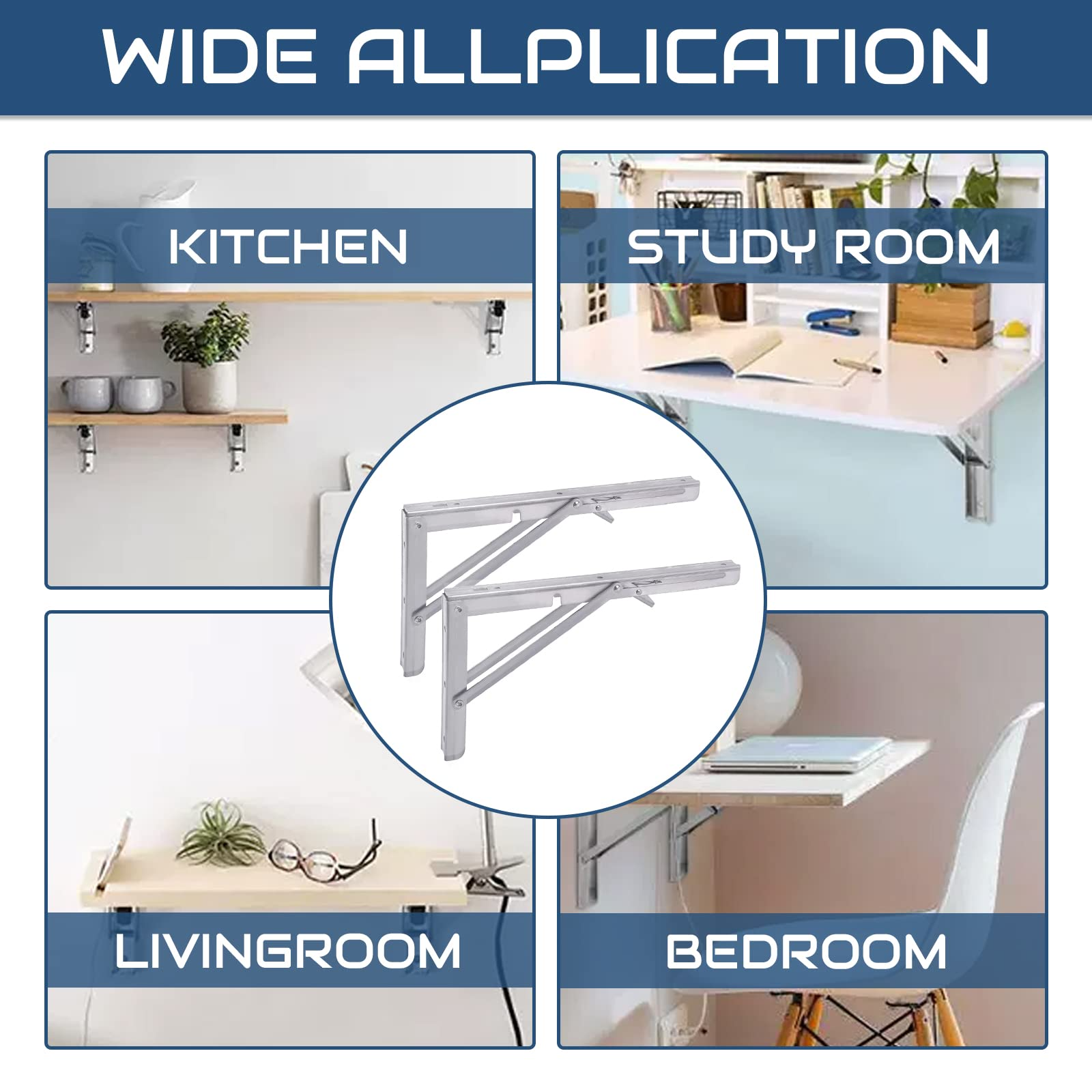 【WIDE APPLICATION】Wall mount folding table brackets suitable for tables anywhere. The L-bracket heavy duty can be folded by pressing the release arm. Sturdy structure is enough to be used as bookshelf, kitchen shelf, exhibition shelf, garden shelf, external wall bracket, etc. Heavy duty stainless steel folding shelf bracket is very suitable for your garage style.