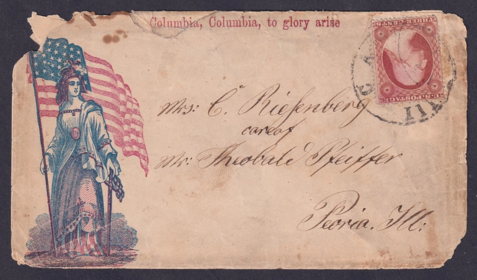 A good c.1862 Civil War Patriotic cover "Columbia, Columbia to glory arise", Bischel 4084. Franked with a 3c Red and cancelled with a CAIRO, IL CDS. Sent to Peoria, Illinois. A bit damaged. No back stamps, no contents.