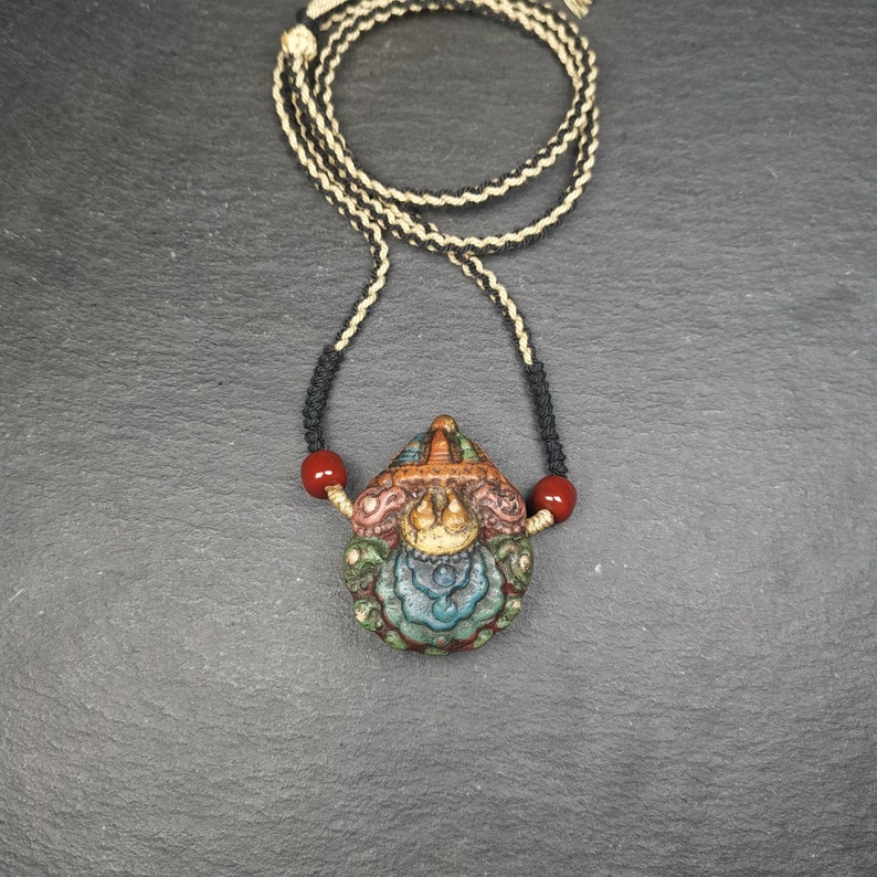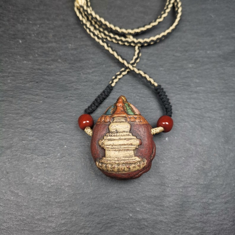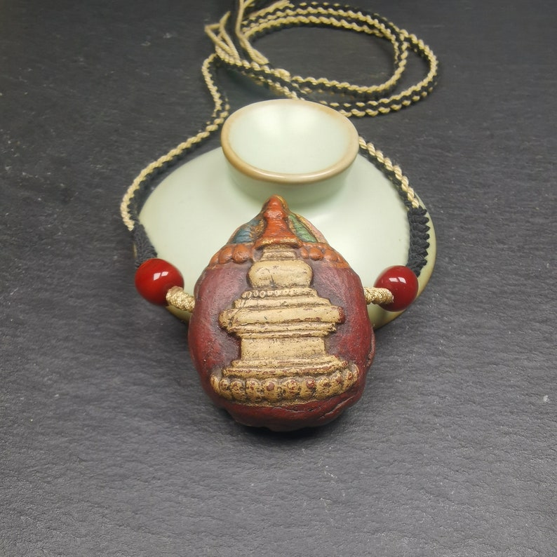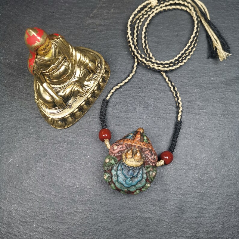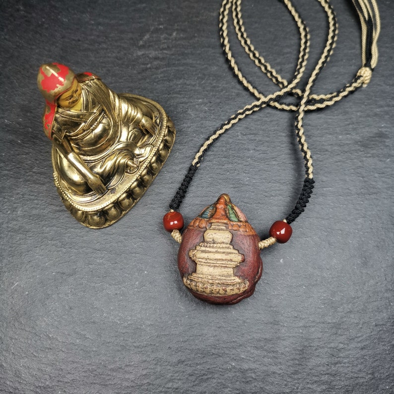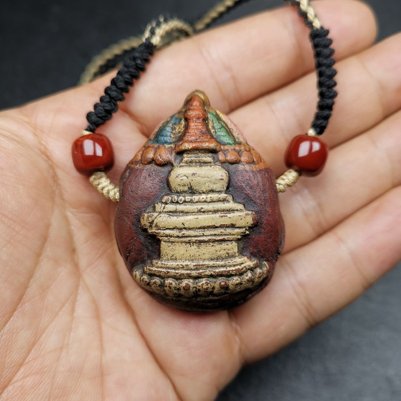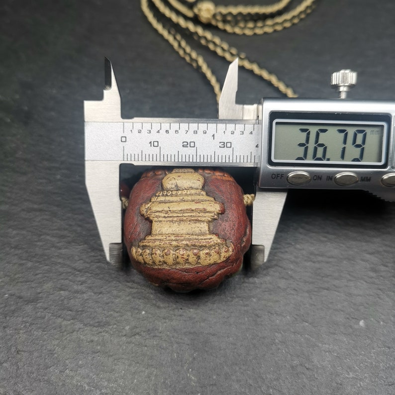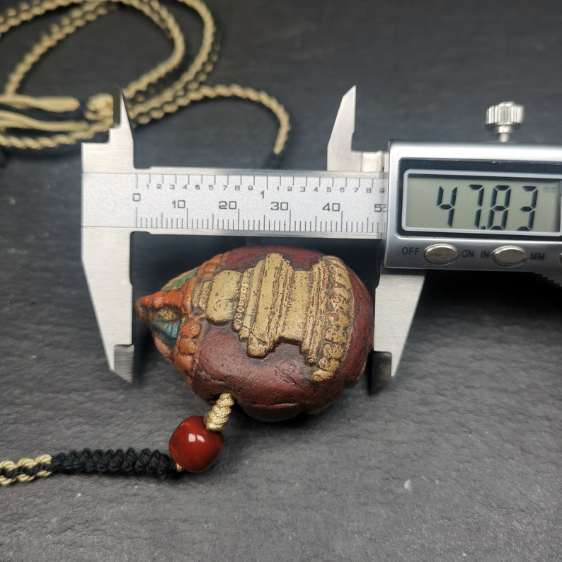 It is in the shape of a stupa, with two sides carved, one side is a stupa and the other side is a Scorpion Guru,you can show any side according to your mood.