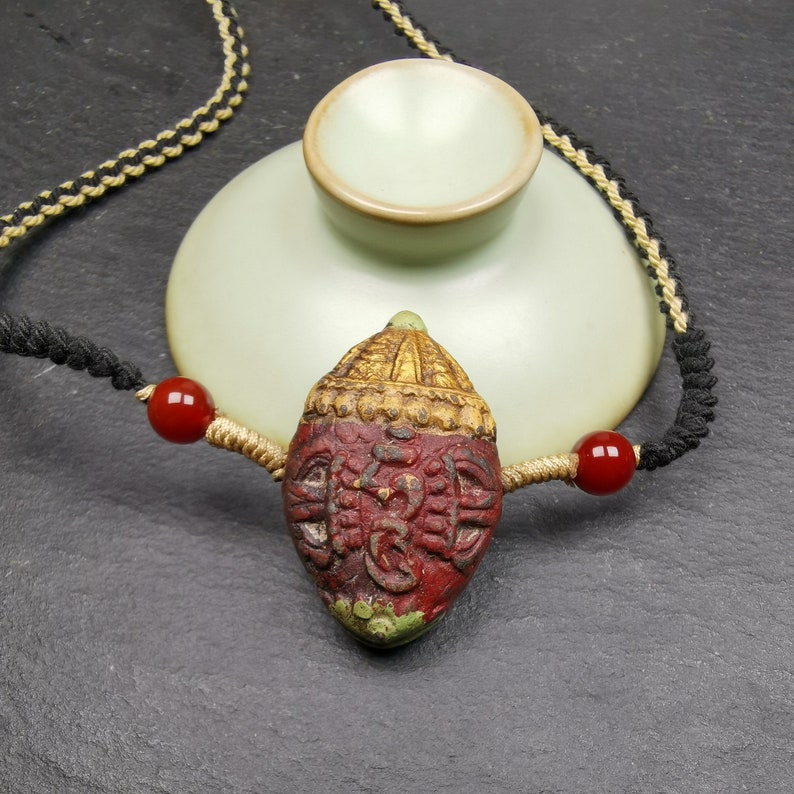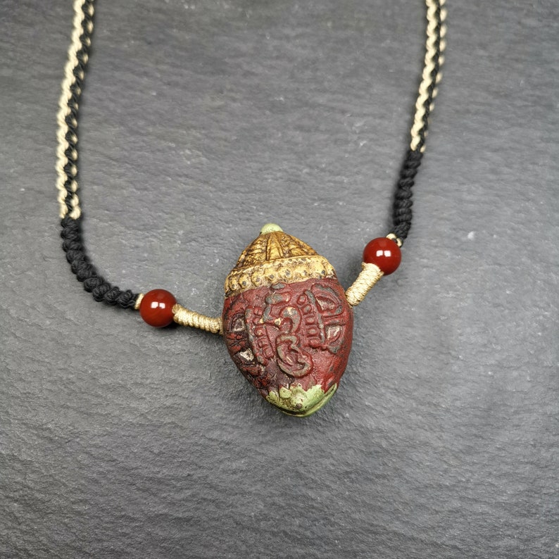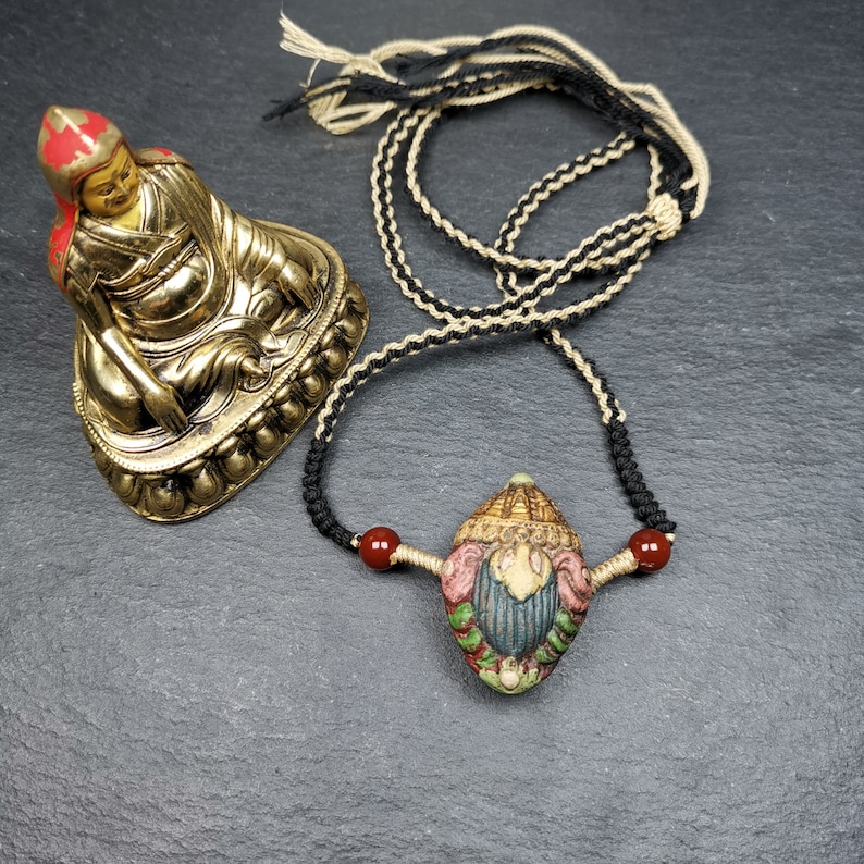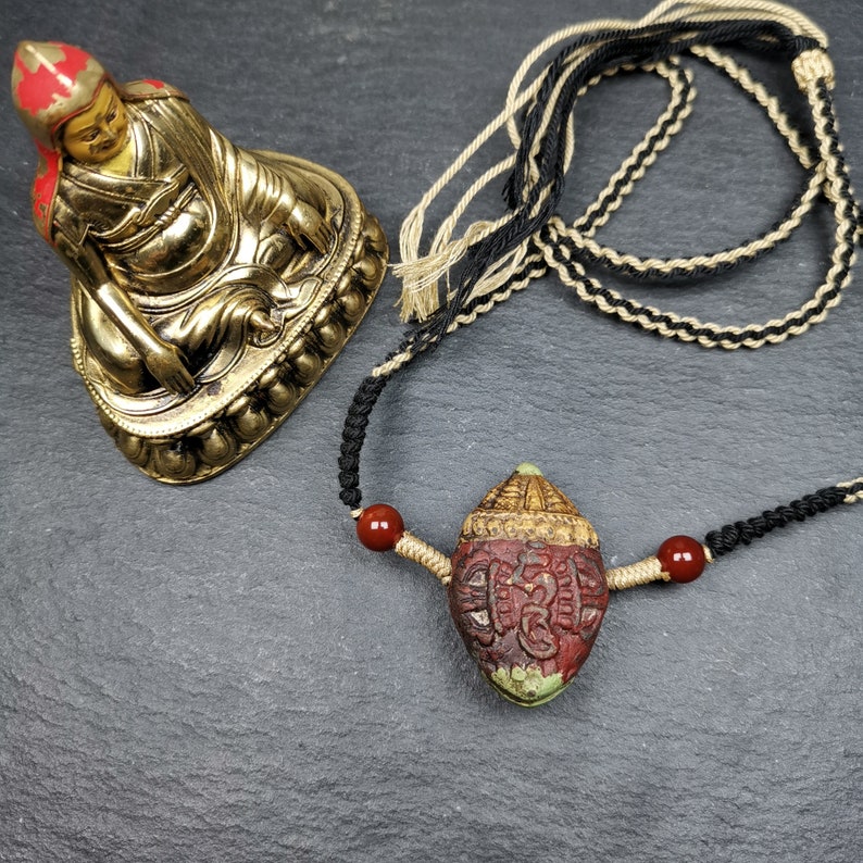 It is in the shape of a stupa, with two sides carved, one side is a vajra and the other side is a bodhi leaf.