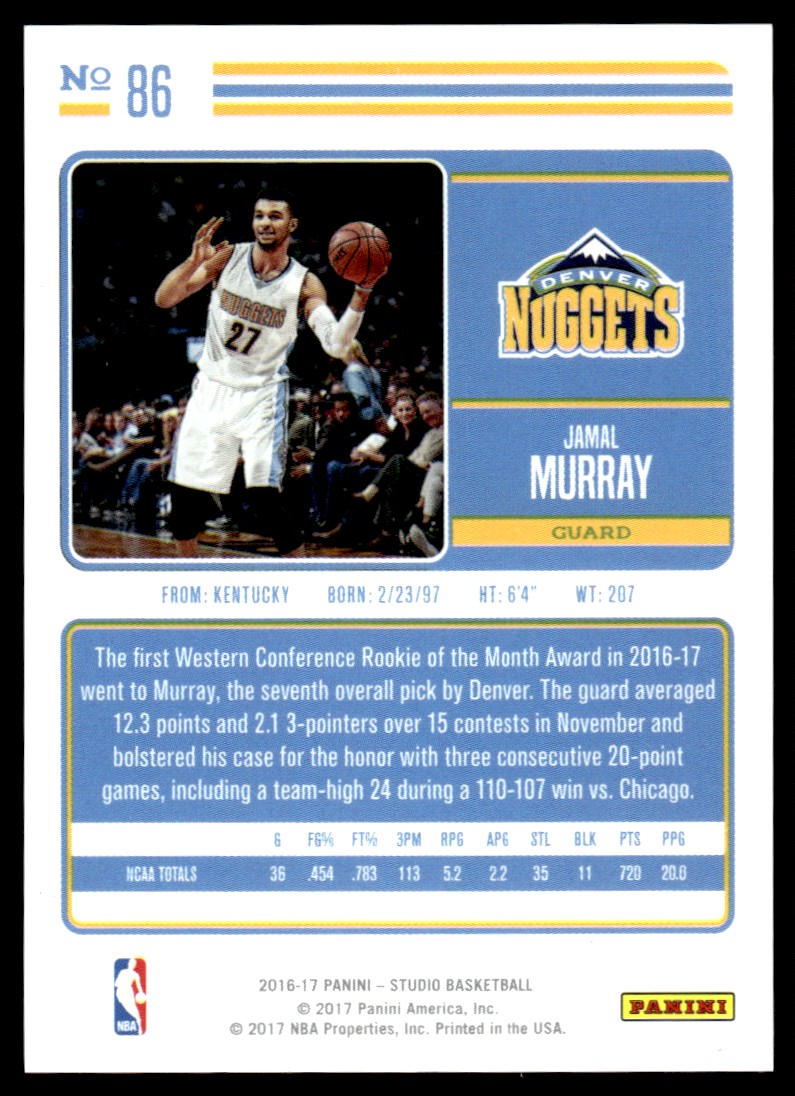 2016-17 Panini Studio Jamal Murray Rookie Denver Nuggets #86