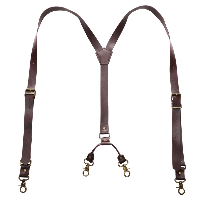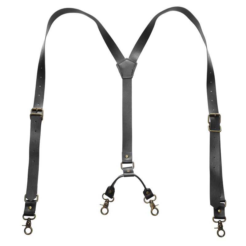 Men y-back PU leather suspenders with four metal clips, adjustable buckles and rivets.