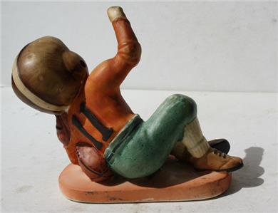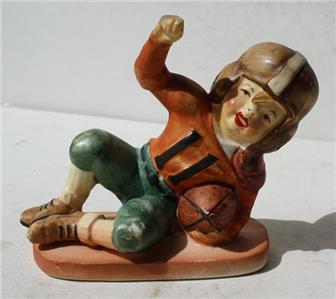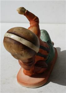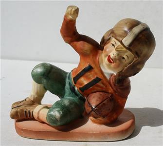 Here is a great vintage Ceramic Hand Painted Made in Japan Football Player Sliding with Football helmet and Football and cleats and Football Uniform on base Figurine. It is Awesome. It is marked Made in Japan on bottom-SEE ALL PHOTOS. It measures about 4 inches tall by about 5 inches wide. Grab this great vintage collectible while you still can it will not last long.