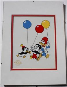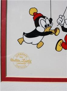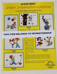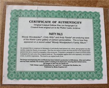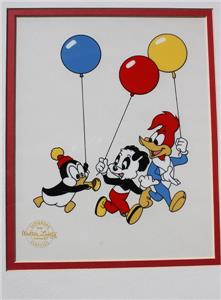 Here is an Awesome Matted and Framed Walter Lantz's Chilly Willy, Woody Woodpecker and Andy Panda Serigraph Cel Limited Edition and comes with a Certificate of Authenticity and original paperwork. This cel comes ready to display in a nice frame and mat. The frame measures 12 inches by 16 inches,and the mat is also 12 by 16 inches. The sericel itself is about 8 by 10 inches. This serigraph pictures Chilly Willey, Woody Woodpecker and Andy Panda with balloons and Chilly with a horn. It is called "Party Pals" and is (LES002). It is truely awesome and I have had it in my collection for years now since I bought it new in 1991. I bought the whole set of 6 that they offered and have the original order form picturing all of the Serigraphs and a letter about purchasing them. These were limited to 5000 and put out by Universal Studios. I have had to down size and can no longer display them. But my loss can be your gain. It is a classic and wonderful Limited Edition cel ready for display. Grab this beauty while you still can.