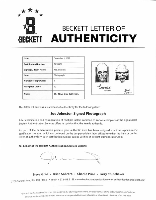 Autographed 11x14 photograph signed in blue permanent marker by Joe Johnston who helped develop The Emperor from Star Wars The Empire Strikes Back and Return of the Jedi. From the Steve Grad Autograph Collection and obtained in person by Steve at a private signing with Joe in Los Angeles in 2012.