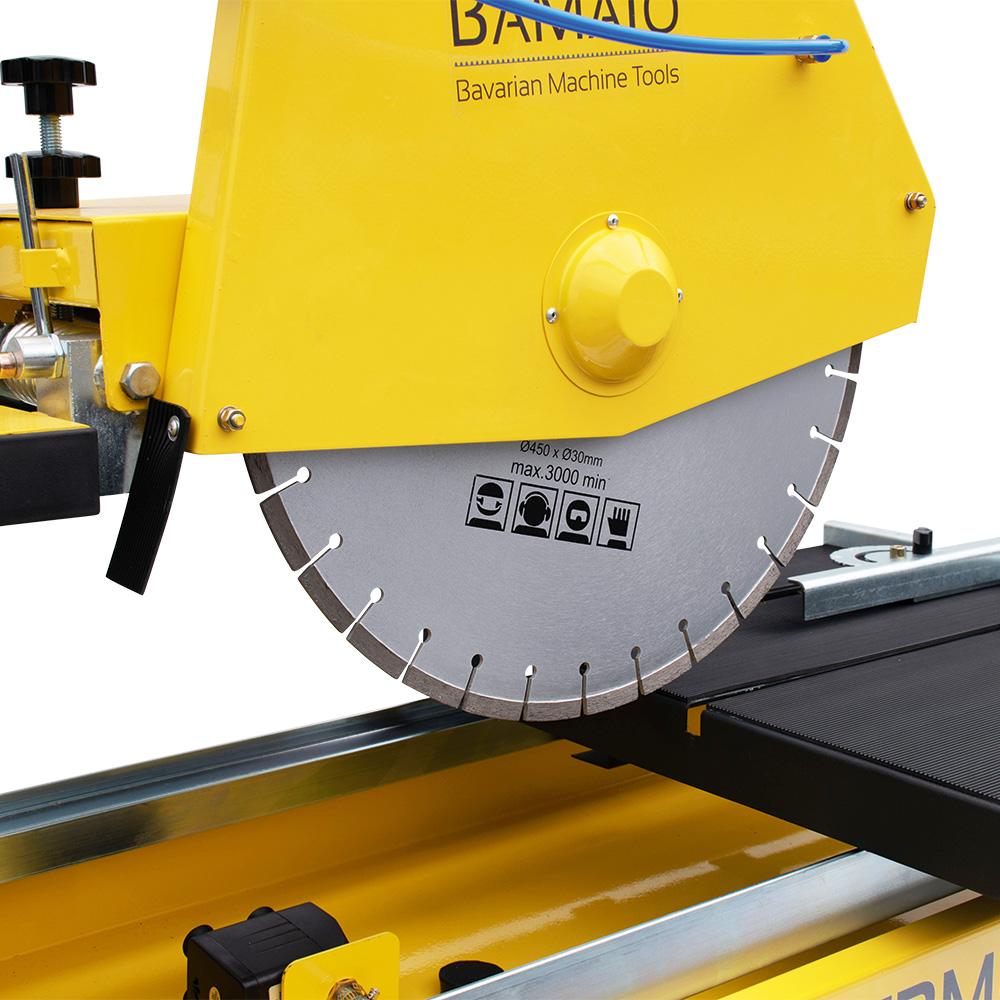 Die BAMATO Steintrennmaschine STRM-455 ist das ideale Werkzeug für präzises Schneiden von Betonpflaster, Randsteinen, Naturpflaster, Klinker uvm. Mit einer Motorleistung von 2200 Watt und einem 450 mm Sägeblatt ermöglicht sie schnelle und saubere Schnittergebnisse. Das Sägeaggregat ist stufenlos von 90° bis 45° schwenkbar, sodass verschiedene Winkel problemlos geschnitten werden können. Die Steintrennmaschine verfügt über eine Schnitthöhe von bis zu 150 mm und eine Schnittlänge von 700 mm, was sie besonders vielseitig macht. Zudem ist das Sägeaggregat stufenlos absenkbar für maximale Flexibilität beim Arbeiten. Die Wasserkühlung sorgt für ein optimales Schnittergebnis, indem sie Staub und Hitzeentwicklung reduziert. Der Maschinenkörper besteht aus einer stabilen Stahlkonstruktion und verfügt über einen beidseitigen Transportgriff für ein einfaches Handling der Maschine. Das einklappbare, federunterstützte Fußgestell und das integrierte Fahrwerk erleichtern den Transport der Maschine zusätzlich. Ob für den Einsatz auf Baustellen oder für den Heimwerker im eigenen Garten, die BAMATO Steintrennmaschine STRM-455 überzeugt durch ihre Leistungsfähigkeit, Robustheit und einfache Bedienbarkeit.