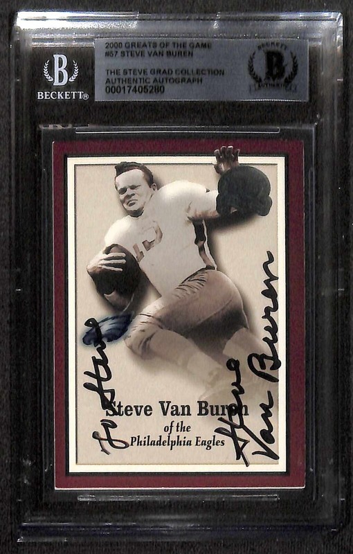 Autographed 2000 Greats of the Game #57 signed in black permanent marker by Philadelphia Eagles Runningback Steve Van Buren (Died August 23, 2012). From the Steve Grad Autograph Collection. The autograph has been authenticated by Beckett Authentication Services.