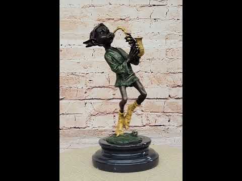 Immerse yourself in the enchanting world of music and whimsy with the Collector Edition Leprechaun Playing Saxophone. Crafted by the skilled hands of artist Juno, this solid bronze sculpture is a testament to fine artistry and creative expression. Using the time-honored lost wax method, each detail is meticulously captured, ensuring a unique and authentic masterpiece.The music lover Leprechaun, perched with saxophone in hand, exudes joy and playful charm. This collector's edition sculpture is a celebration of the magic of music and the mythical allure of the Leprechaun. The multi-color patina adds a vibrant touch, bringing the whimsical character to life. Resting on a round black base, it becomes a focal point for any space, infusing it with both artistic elegance and a sense of musical delight.Elevate your home or office decor with this exceptional bronze sculpture, a harmonious blend of craftsmanship and imagination. Juno's creation invites you to appreciate the intricate details, from the Leprechaun's expressive features to the flowing contours of the saxophone. Each viewing is an opportunity to discover new facets of this delightful piece, making it a cherished addition for both art collectors and music enthusiasts alike.