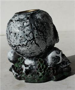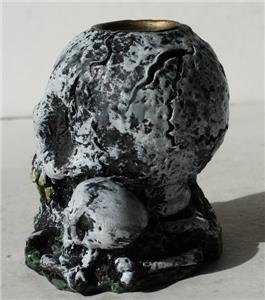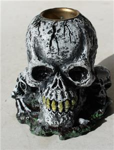 Here's a great resin Unmarked Skull Candle Holder with one big skull in middle and 2 little ones on the side Halloween Decoration Figurine . It is Awesome. It measures about 3 inches tall and about 2 3/4 inches wide. It is unmarked on bottom-SEE ALL PHOTOS!